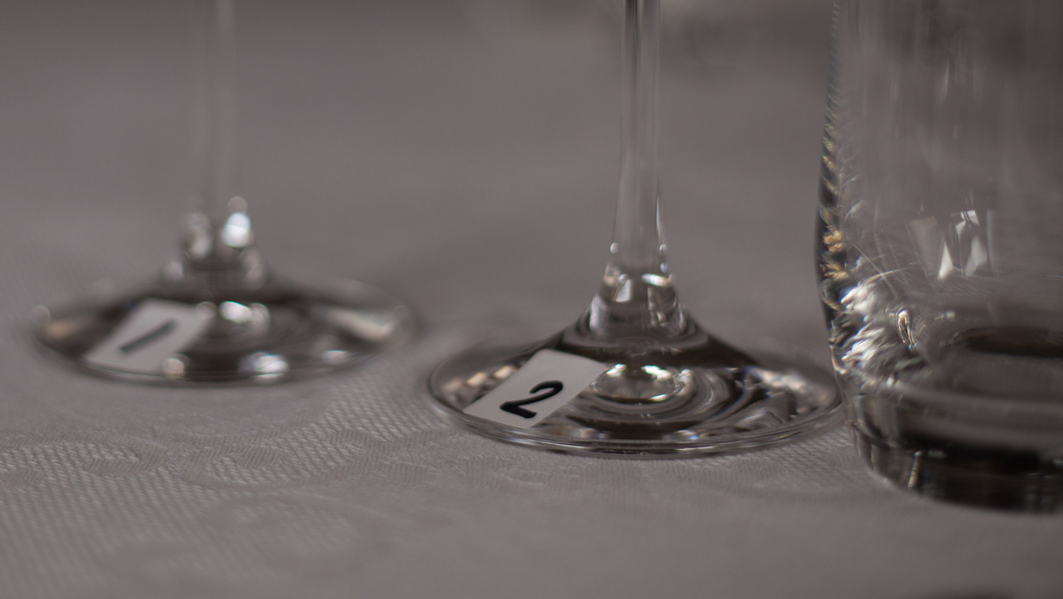 The glasses are labeled to make it easy to keep wines #1 and #2 apart.