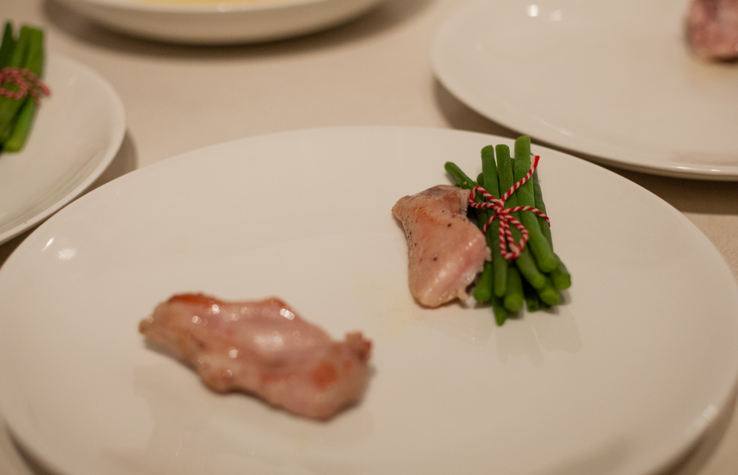 First course: chicken thigh, cooked sous-vide, and served with green beans. Paired with a full-bodied white (Planeta Chardonnay from Sicily) and a light red (Pernand-Vergelesses). Most people preferred the white, but some preferred the red.