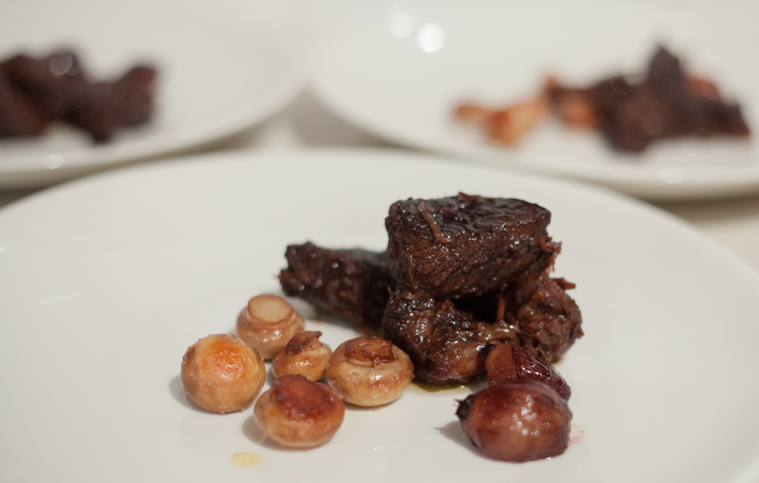 Beef stew with braised pearl onions and sautéed mushrooms, paired with two voluptuous reds: a Carignan from Sardinia and a Brunello di Montalcino. No clear winner here. The Syrah from Minervois that I served a week later, was clearly a winning combination with this dish.