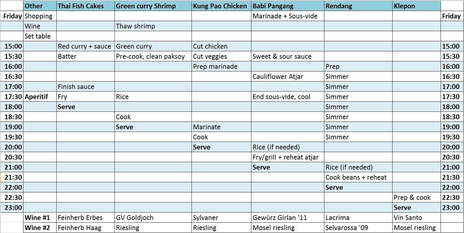 The carnivores menu was relatively simple as almost everything was cooked sous-vide, but usually I make a schedule such as the one shown above. Such a schedule helps me not to forget important steps, as well as identify any issues with respect to simultaneous need for multiple ovens or sous-vide machines. It also provides an indication of how much help I will need in the afternoon.