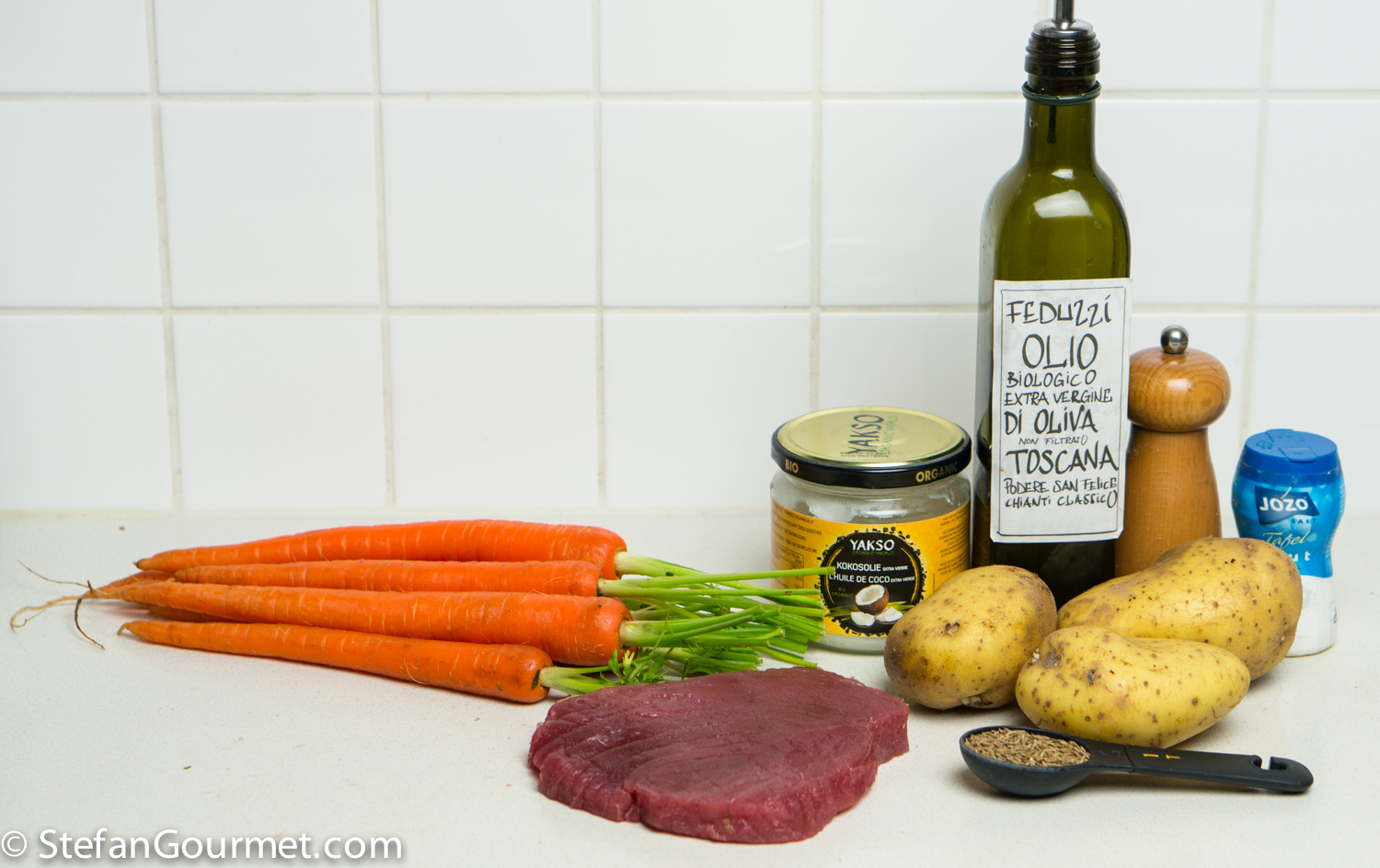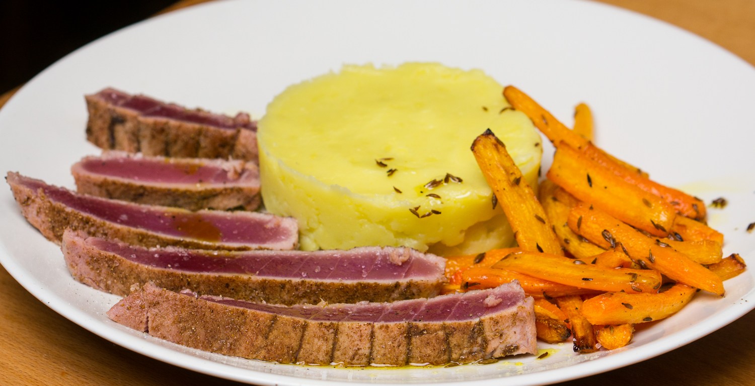 Slice the tuna and serve it with the mashed potatoes and carrots on preheated plates. Season the tuna and carrots with coarse sea salt and freshly ground black pepper.