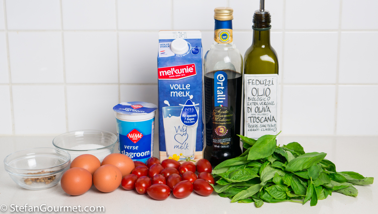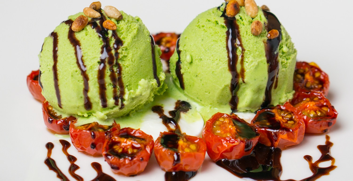 How about insalata caprese for dessert? Most of us love the famous combination of tomato, buffalo mozzarella, and basil as a savory dish. But it is also delicious as a dessert with the basil transformed into ice cream. The technique for making basil ice cream is the same as for making mint ice cream. Cherry tomatoes are roasted in the oven to bring out their sweetness (with a bit of sugar added for good measure). The buffalo mozzarella just needs to be served at room temperature to bring out its flavor. Balsamic vinegar is not a good idea on the savory version of insalata caprese (because it would overpower the other flavors), but a balsamic syrup is great when drizzled on top of this. As a finishing touch, a drizzle of the best extra virgin olive oil you can afford. And some toasted pine kernels. What’s not to love?