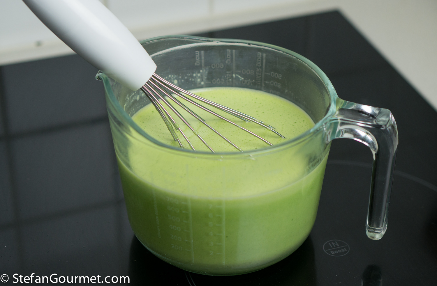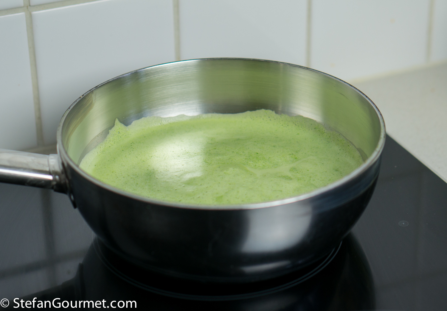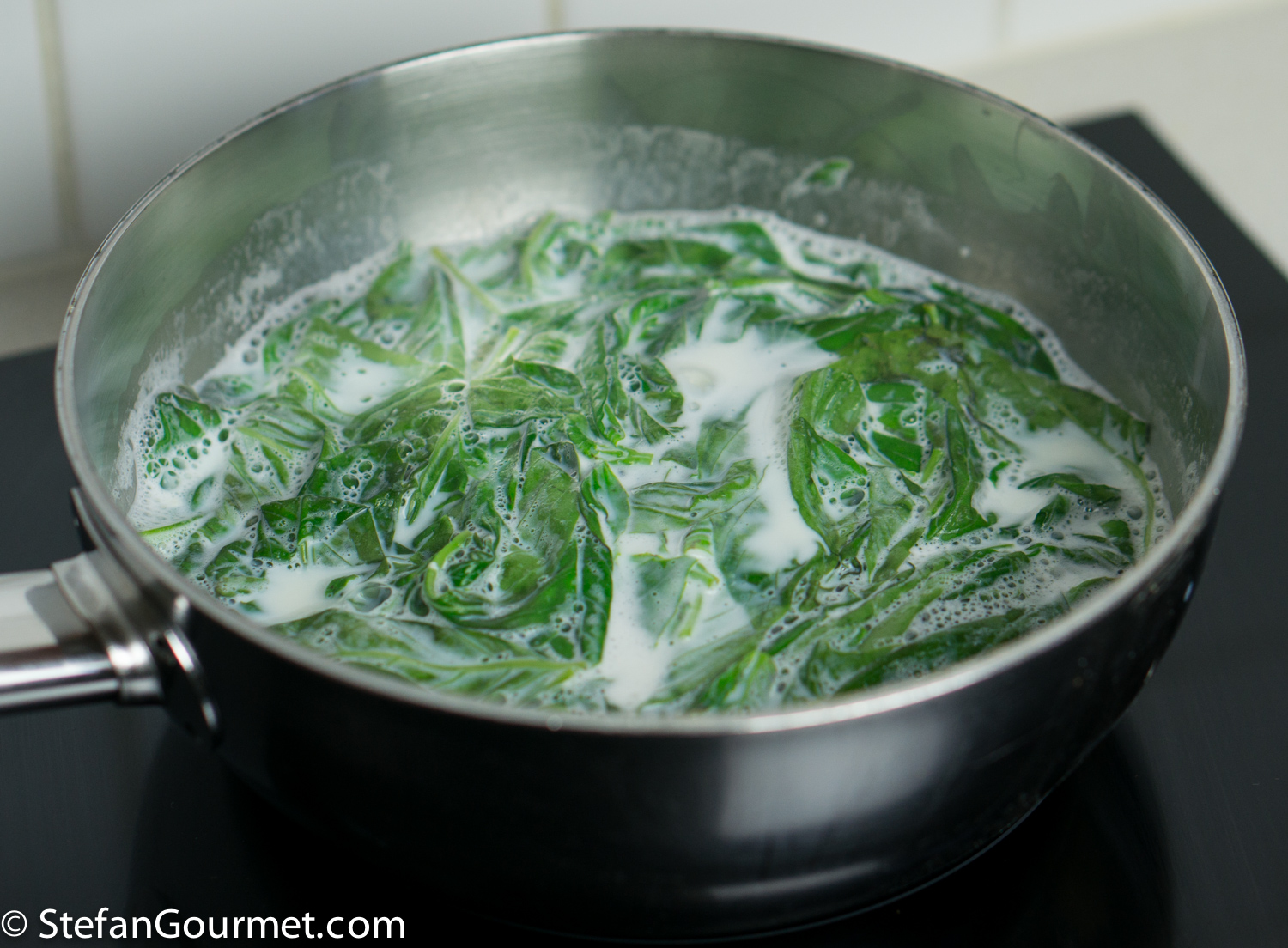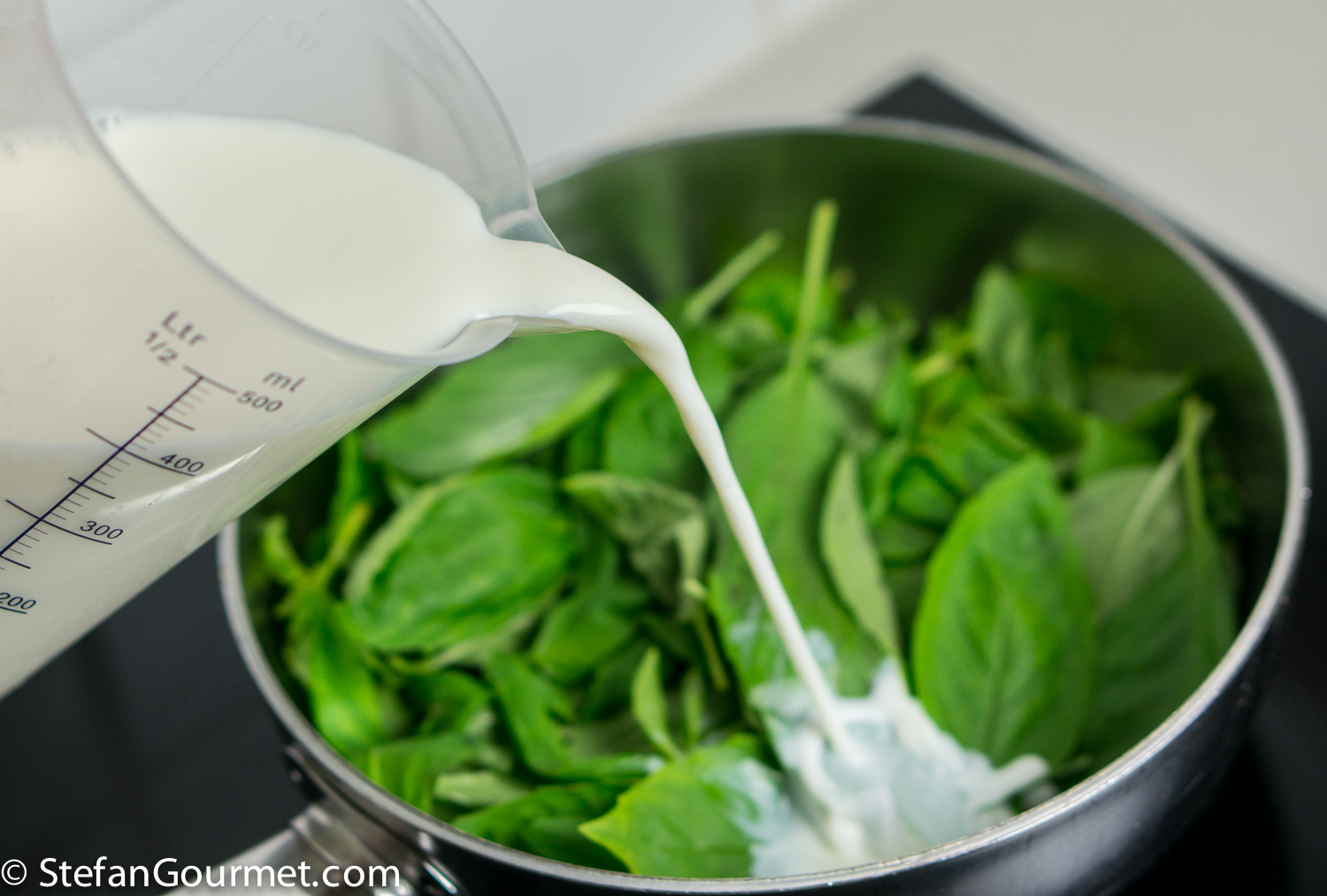 Wash and dry 50 grams of basil leaves. Put them in a saucepan, and cover with 375 ml (1 1/2 cups) of whole milk.
