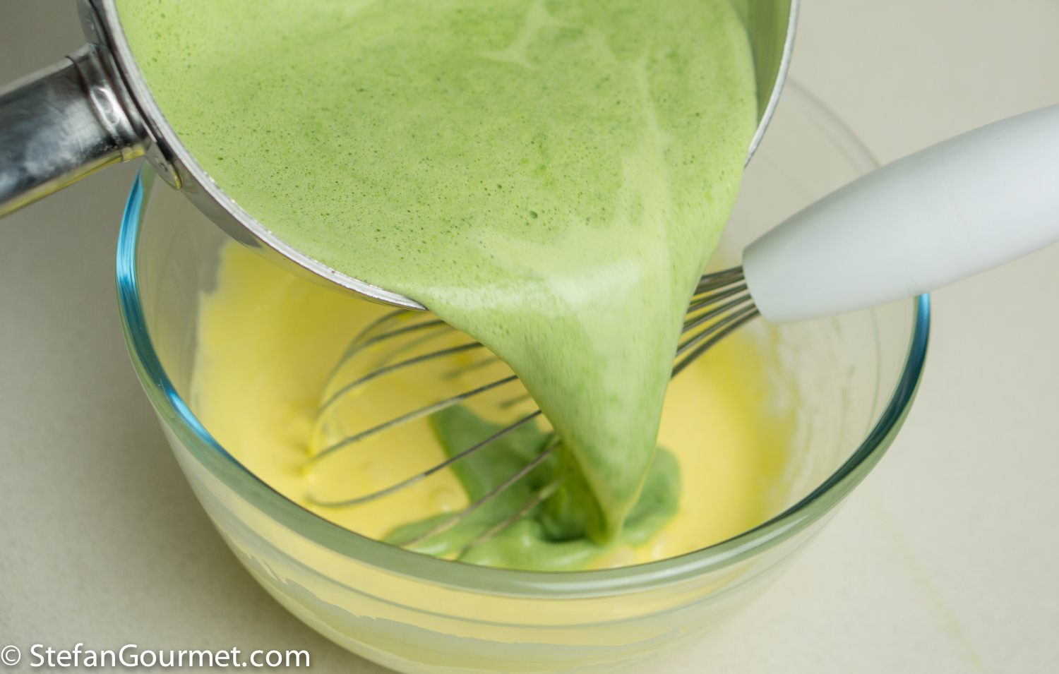 Now add the basil-infused milk to the egg yolk and sugar mixture, and whisk to mix.