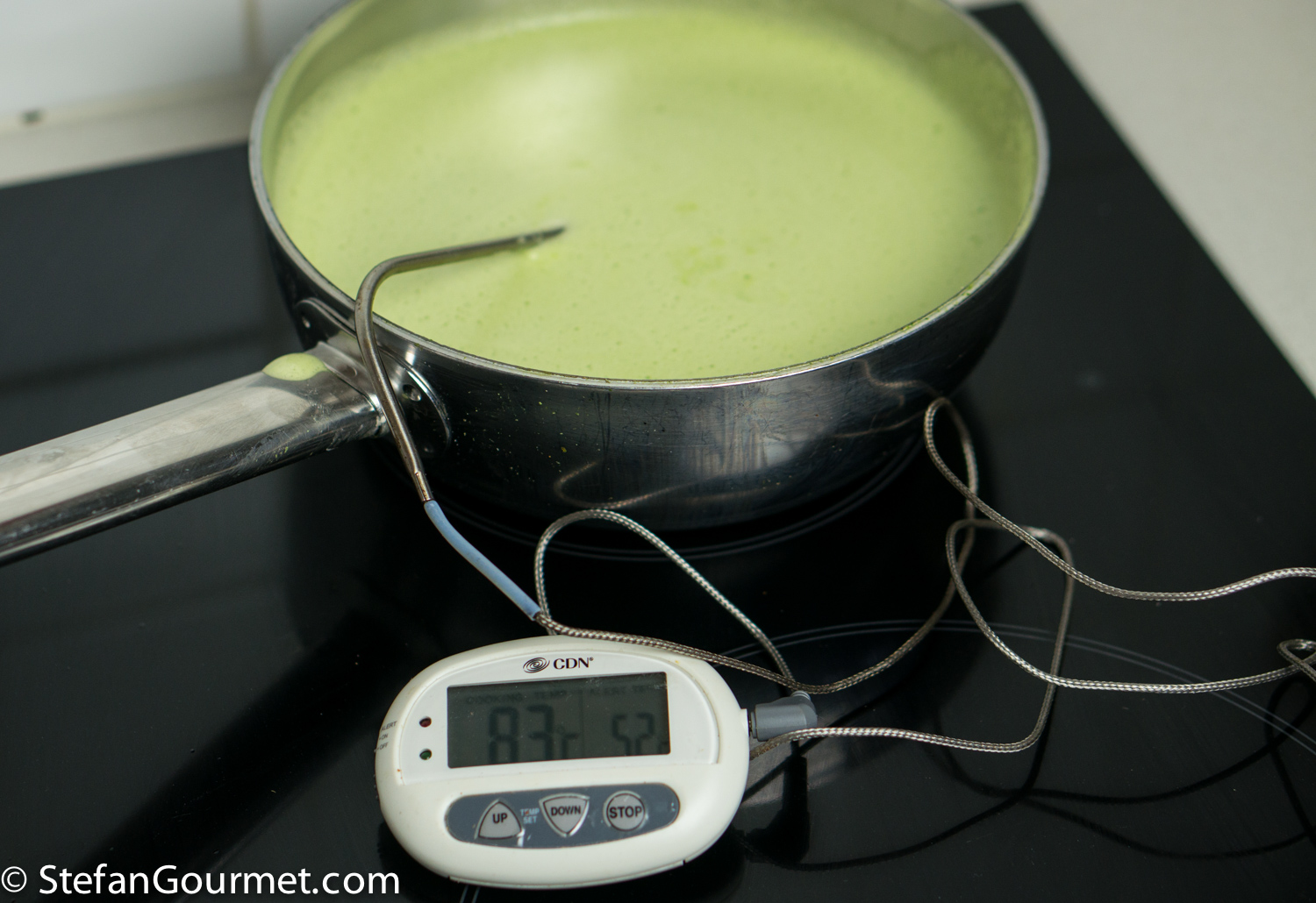Heat to about 85C/185F over medium high heat, while stirring constantly. I like to use a thermometer with a probe, as it allows me to heat the mixture quickly without the risk of bringing it to a boil (we don’t want that to happen as the eggs would curdle). If you don’t use a thermometer, you could also stir over medium low heat until the mixture coats the back of the spoon. That will take a lot longer and I am not a very patient person.