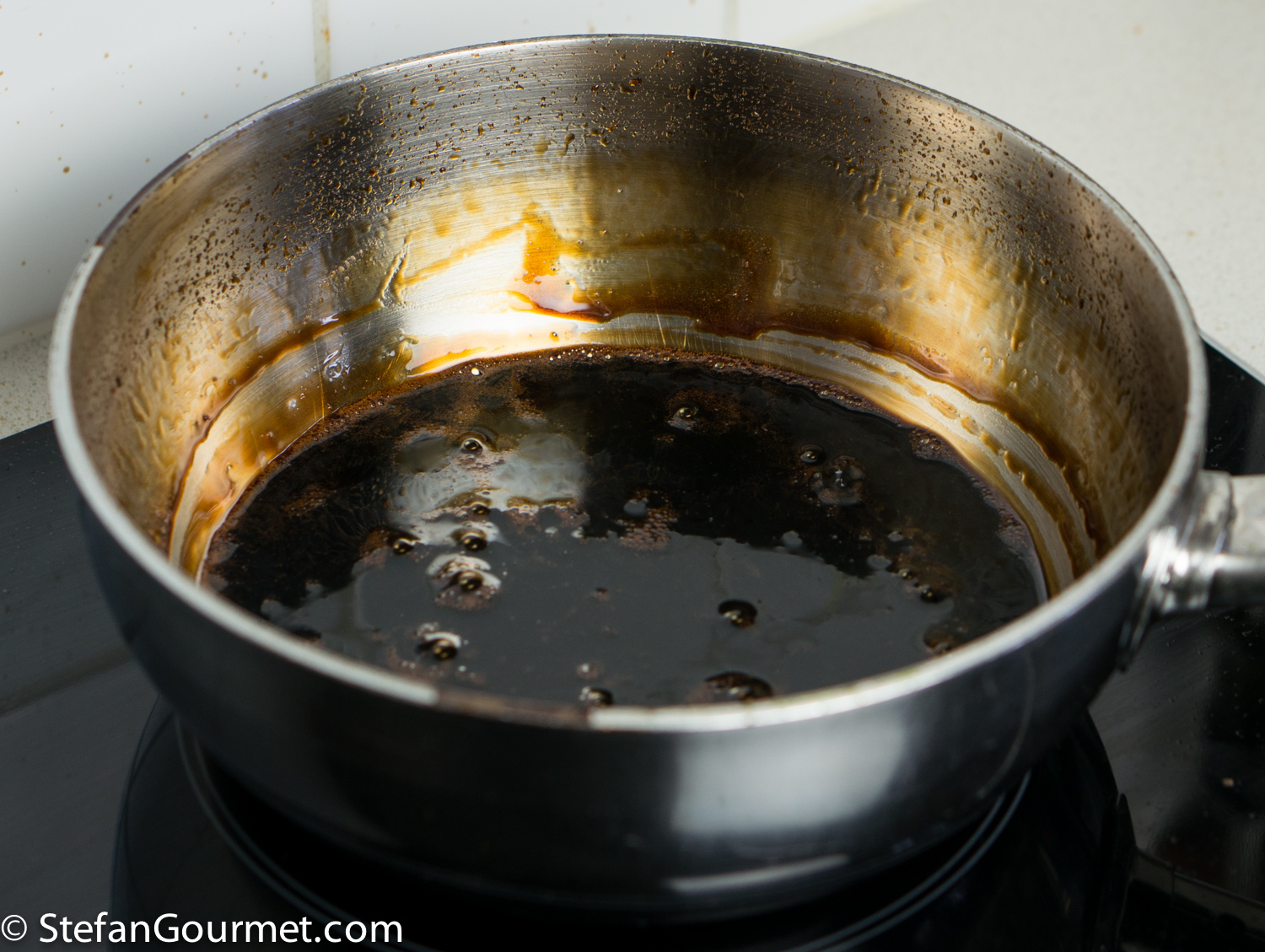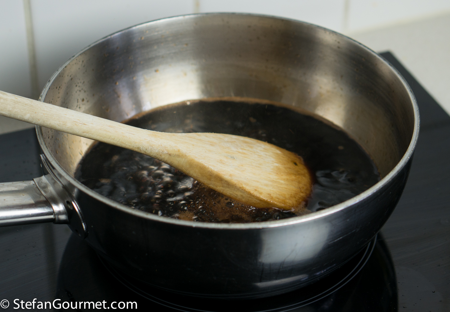 Simmer the mixture until it is thick and syrupy and reduced to about 125 ml (1/2 cup). Take into account that the syrup will become thicker and may even harden as it cools. If the syrup becomes solid when it cools off to room temperature, add a bit of balsamic vinegar and stir over low heat to loosen up the syrup and mix in the balsamic you just added. Allow the balsamic syrup to cool to room temperature. (Store any leftover balsamic syrup in the refrigerator in a covered container. It will keep for a long time.)