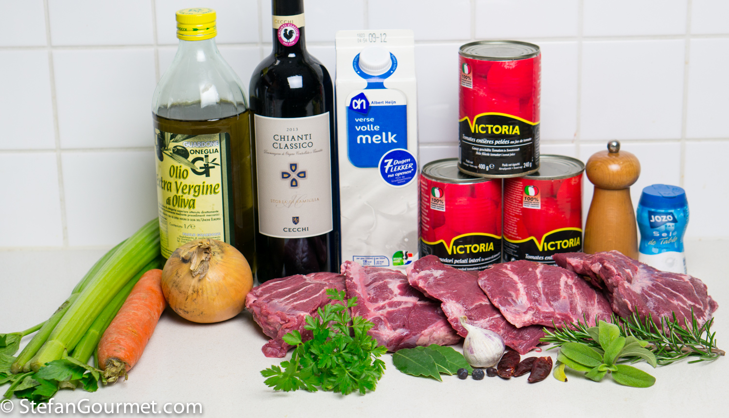 DSC08193 For 12-18 servings 1.5 kilo (3.5 lb) wild boar cheeks 150 grams (1 cup) minced carrot 150 grams (1 cup) minced celery 150 grams (1 cup) minced onion 3 cans (400 grams/14 oz each) peeled tomatoes 375 ml (1/2 bottle) full-bodied red wine, preferably Italian sangiovese (Chianti or Rosso di Montalcino) 375 ml (1 1/2 cup) milk 3 cloves garlic 2 bay leaves 2 sprigs fresh rosemary 2 sprigs fresh sage 2 sprigs fresh parsley 2 dried chile peppers (peperoncino) 3 juniper berries olive oil salt and freshly ground black pepper