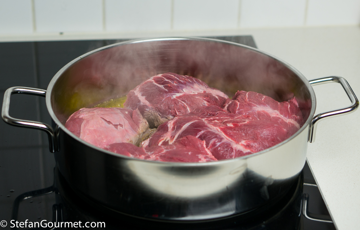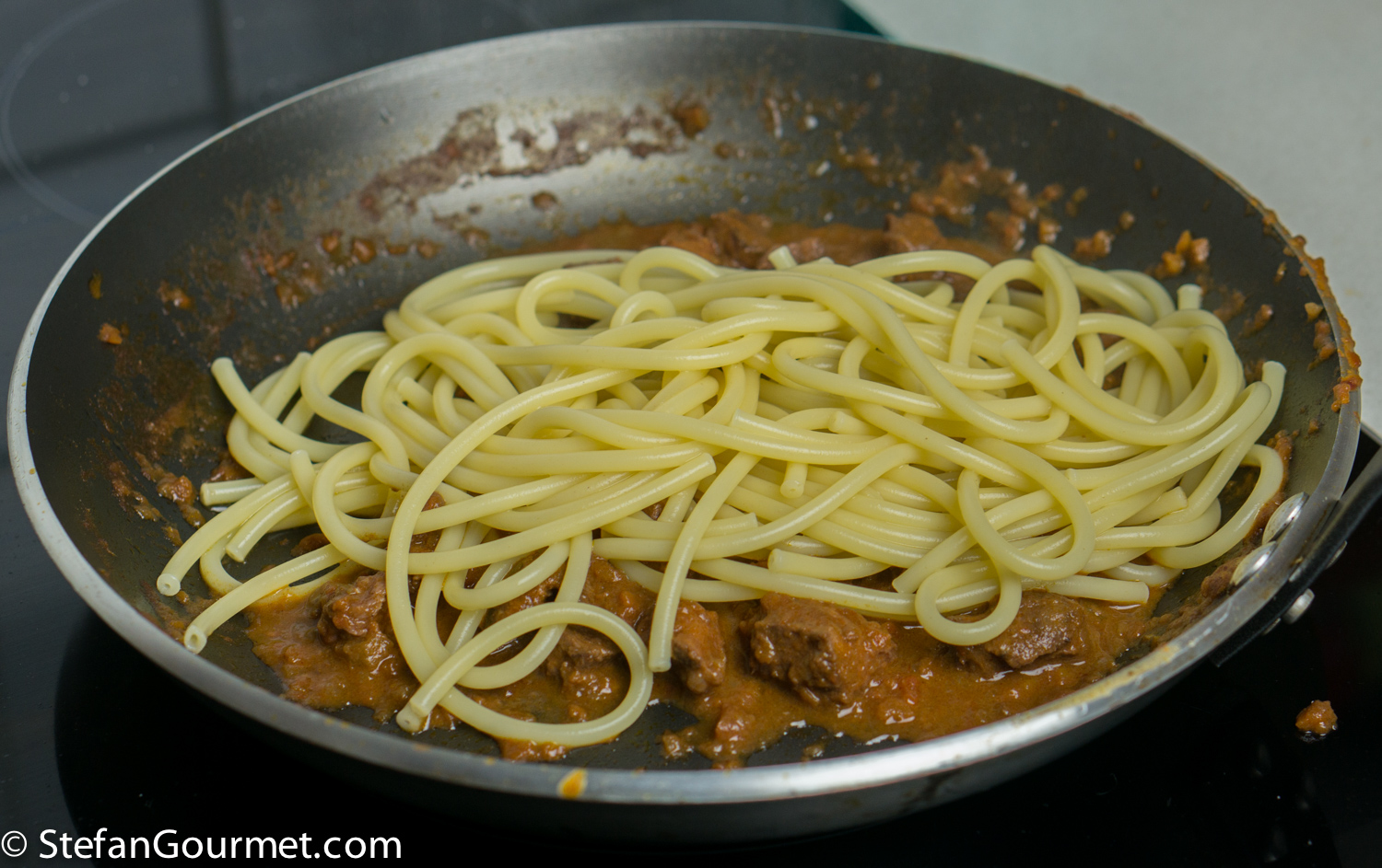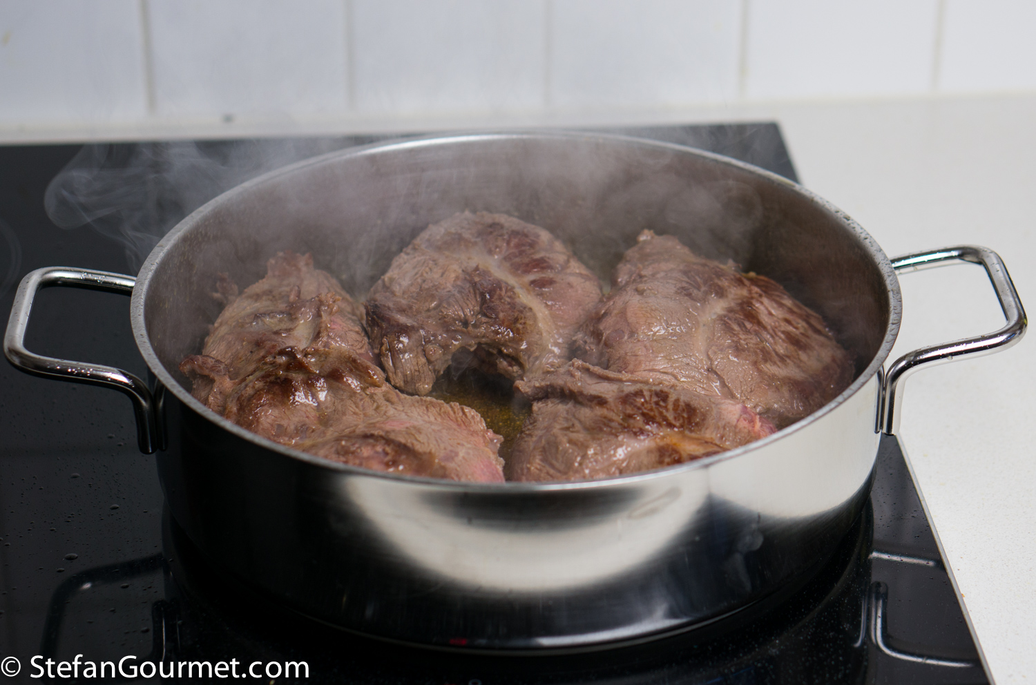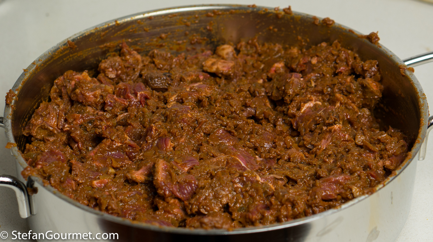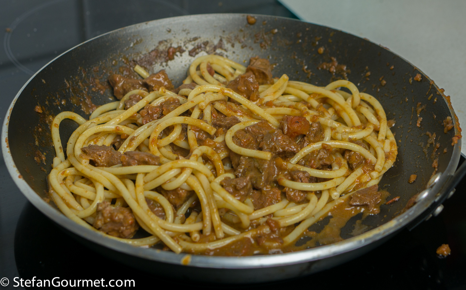 DSC08196 Heat a generous amount of olive oil in a large wide frying pan. Add the boar cheeks. If they don’t fit in a single layer, brown them in batches. DSC08198 Brown the cheeks on all sides over high heat. DSC08200 Take the cheeks out of the pan and set aside to cool. DSC08202 There will now be a lot of flavorful browned bits stuck to the pan. We want to include those into our ragù. DSC08204 Add 450 grams (1 pound) of finely minced carrot, onion, and celery, and 3 minced garlic cloves. I use the food processor to mince this. Season with salt so the vegetables will release some of their water. DSC08205 Cook over medium high heat, stirring with a wooden spatula and scraping the bottom to get all the browned bits. The water released by the vegetables helps with this. DSC08206 Keep stirring until the vegetables are starting to brown. DSC08207 Add 375 ml (1/2 bottle) of red wine. DSC08208 Bring to a boil, then reduce to a simmer. DSC08212 Simmer uncovered until the wine has been reduced by half, about 10 minutes. DSC08218 Puree 3 cans of peeled tomatoes in the food processor, then add them to the ragù and stir to incorporate. DSC08220 Make two bouquet garni by binding together a bay leaf with sprigs of parsley, sage, and rosemary, and add them to the pan. Add 3 juniper berries as well. DSC08222 Bring to a boil, then reduce to a simmer, and cook uncovered for about an hour. DSC08234 Meanwhile, cut the cheeks into slices and then into bite-size morsels. The meat will still be raw on the inside. DSC08238 Allow the morsels to cool in the refrigerator. DSC08235 A lot of juices will leak out of the browned meat and collect on the plate. (This is clear evidence that browning the meat does not serve to “seal in the juices” as many cookbooks still tell you.) DSC08236 Add these juices to the sauce, as we don’t want to lose any flavor. DSC08237 After an hour of simmering, add 375 ml (1 1/2 cups) of whole milk, and stir to incorporate. DSC08253 Bring back to a simmer, and simmer for about half an hour longer, or until the sauce is nice and thick. DSC08254 Fish out the two bouquets garni… DSC08255 …and the three juniper berries. When using a chamber vacuum sealer, allow the sauce to cool to room temperature before you continue. DSC08296 Add the meat to the sauce… DSC08297 …and stir to incorporate. DSC08299 Vacuum seal the ragù in portions using either a chamber vacuum sealer (for this the sauce needs to be cool before you can vacuum seal) or ziplock bags and the water displacement method (for which the sauce can still be warm). DSC08301 Cook sous-vide for 3 days at 62C/144F. DSC08302 After the 3 days of sous-vide cooking, you can either continue to serve the sauce over pasta right away, or chill and store the sauce for later use. To do the latter, submerge the bags in water with ice cubs until they have cooled off, and then refrigerate or freeze them. Before using, heat them back up in the sous-vide for 1-2 hours at 62C/144F before continuing. DSC08303 The meat will have released juices during the cooking process, so the ragù will be too thin. Strain the liquid part of the ragù into a frying pan. Reserve the solid part. DSC08304 Bring this to a boil, and simmer this to reduce while you boil the pasta. DSC08306 When the liquids have reduced to your liking, add the meat and allow to warm through over low heat. DSC08307 When the pasta is cooked, drain it, and add it to the sauce. In this case I used bucatini because I didn’t have pici or pappardelle. DSC08308 Toss to mix. DSC08311 Serve on preheated plates. You could add grated parmigiano or pecorino if you like.