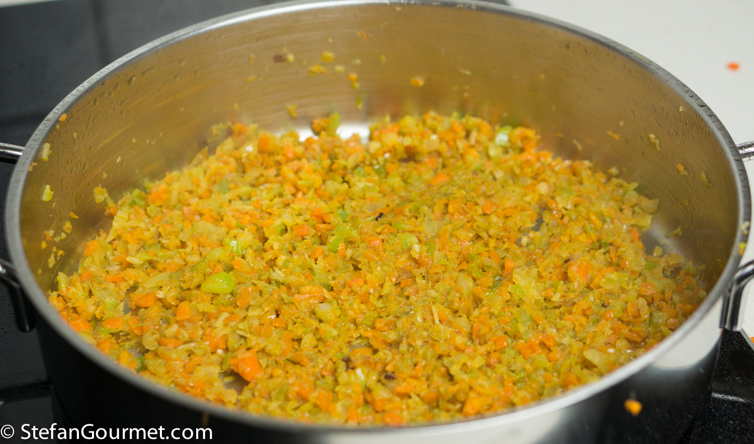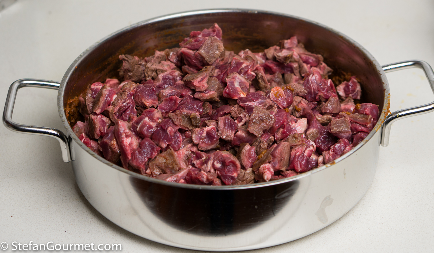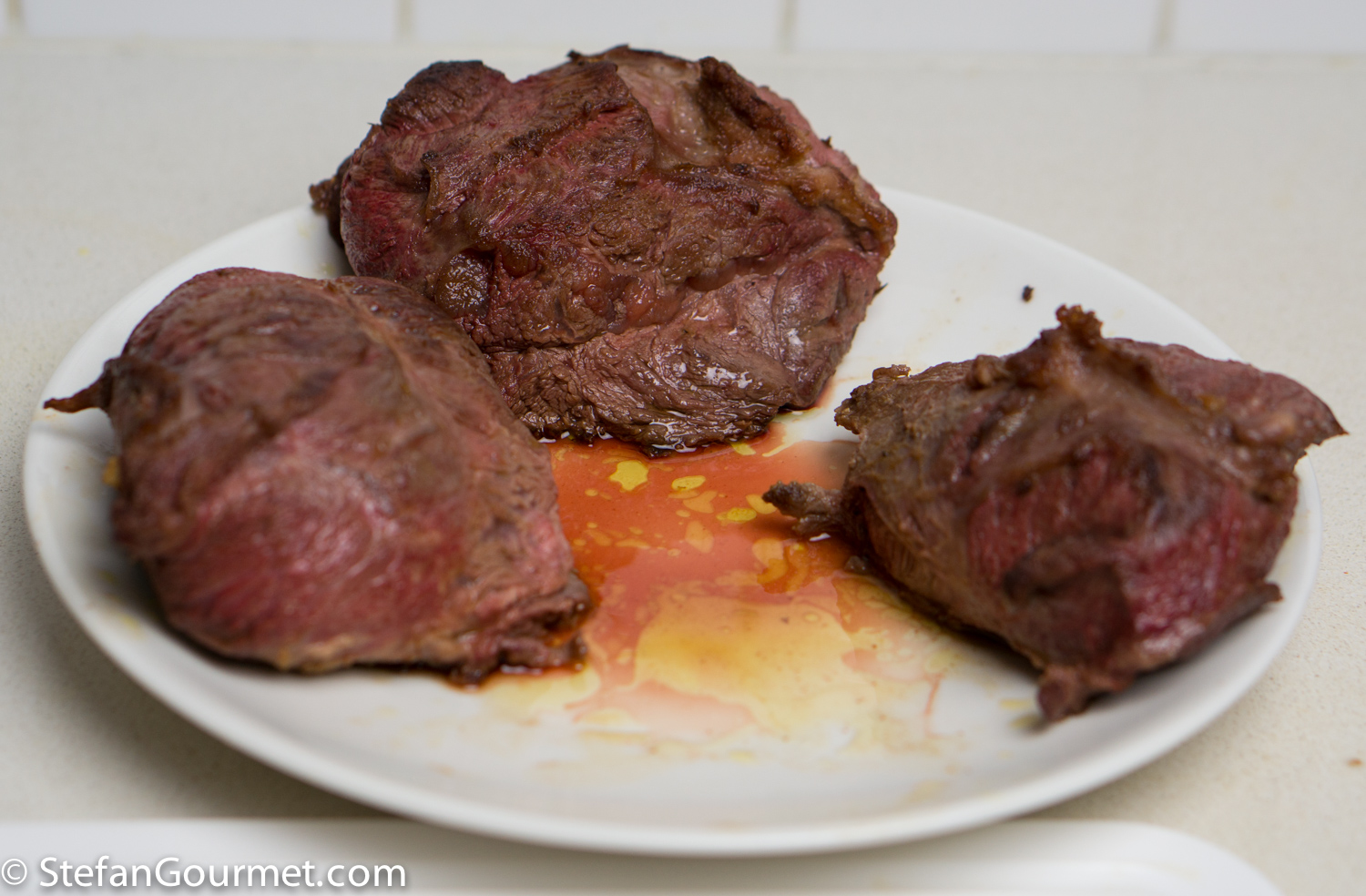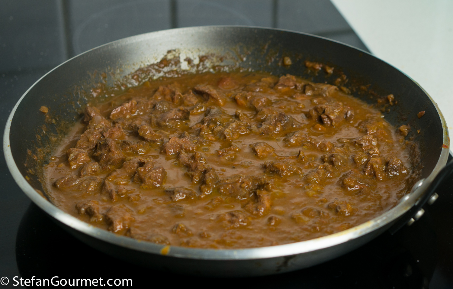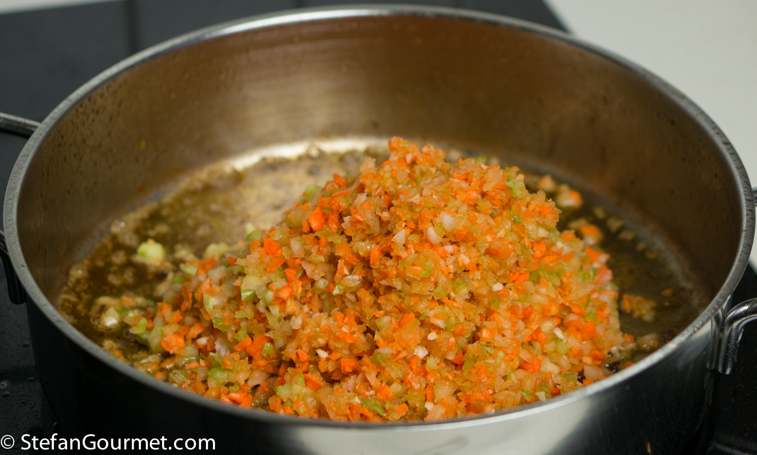 DSC08196 Heat a generous amount of olive oil in a large wide frying pan. Add the boar cheeks. If they don’t fit in a single layer, brown them in batches. DSC08198 Brown the cheeks on all sides over high heat. DSC08200 Take the cheeks out of the pan and set aside to cool. DSC08202 There will now be a lot of flavorful browned bits stuck to the pan. We want to include those into our ragù. DSC08204 Add 450 grams (1 pound) of finely minced carrot, onion, and celery, and 3 minced garlic cloves. I use the food processor to mince this. Season with salt so the vegetables will release some of their water. DSC08205 Cook over medium high heat, stirring with a wooden spatula and scraping the bottom to get all the browned bits. The water released by the vegetables helps with this. DSC08206 Keep stirring until the vegetables are starting to brown. DSC08207 Add 375 ml (1/2 bottle) of red wine. DSC08208 Bring to a boil, then reduce to a simmer. DSC08212 Simmer uncovered until the wine has been reduced by half, about 10 minutes. DSC08218 Puree 3 cans of peeled tomatoes in the food processor, then add them to the ragù and stir to incorporate. DSC08220 Make two bouquet garni by binding together a bay leaf with sprigs of parsley, sage, and rosemary, and add them to the pan. Add 3 juniper berries as well. DSC08222 Bring to a boil, then reduce to a simmer, and cook uncovered for about an hour. DSC08234 Meanwhile, cut the cheeks into slices and then into bite-size morsels. The meat will still be raw on the inside. DSC08238 Allow the morsels to cool in the refrigerator. DSC08235 A lot of juices will leak out of the browned meat and collect on the plate. (This is clear evidence that browning the meat does not serve to “seal in the juices” as many cookbooks still tell you.) DSC08236 Add these juices to the sauce, as we don’t want to lose any flavor. DSC08237 After an hour of simmering, add 375 ml (1 1/2 cups) of whole milk, and stir to incorporate. DSC08253 Bring back to a simmer, and simmer for about half an hour longer, or until the sauce is nice and thick. DSC08254 Fish out the two bouquets garni… DSC08255 …and the three juniper berries. When using a chamber vacuum sealer, allow the sauce to cool to room temperature before you continue. DSC08296 Add the meat to the sauce… DSC08297 …and stir to incorporate. DSC08299 Vacuum seal the ragù in portions using either a chamber vacuum sealer (for this the sauce needs to be cool before you can vacuum seal) or ziplock bags and the water displacement method (for which the sauce can still be warm). DSC08301 Cook sous-vide for 3 days at 62C/144F. DSC08302 After the 3 days of sous-vide cooking, you can either continue to serve the sauce over pasta right away, or chill and store the sauce for later use. To do the latter, submerge the bags in water with ice cubs until they have cooled off, and then refrigerate or freeze them. Before using, heat them back up in the sous-vide for 1-2 hours at 62C/144F before continuing. DSC08303 The meat will have released juices during the cooking process, so the ragù will be too thin. Strain the liquid part of the ragù into a frying pan. Reserve the solid part. DSC08304 Bring this to a boil, and simmer this to reduce while you boil the pasta. DSC08306 When the liquids have reduced to your liking, add the meat and allow to warm through over low heat. DSC08307 When the pasta is cooked, drain it, and add it to the sauce. In this case I used bucatini because I didn’t have pici or pappardelle. DSC08308 Toss to mix. DSC08311 Serve on preheated plates. You could add grated parmigiano or pecorino if you like.