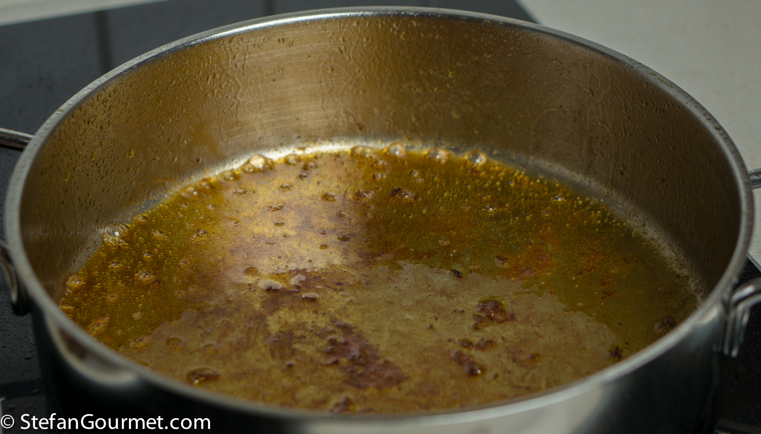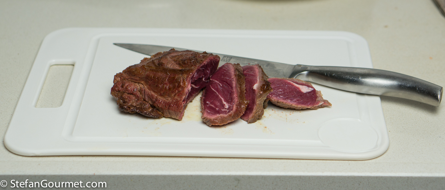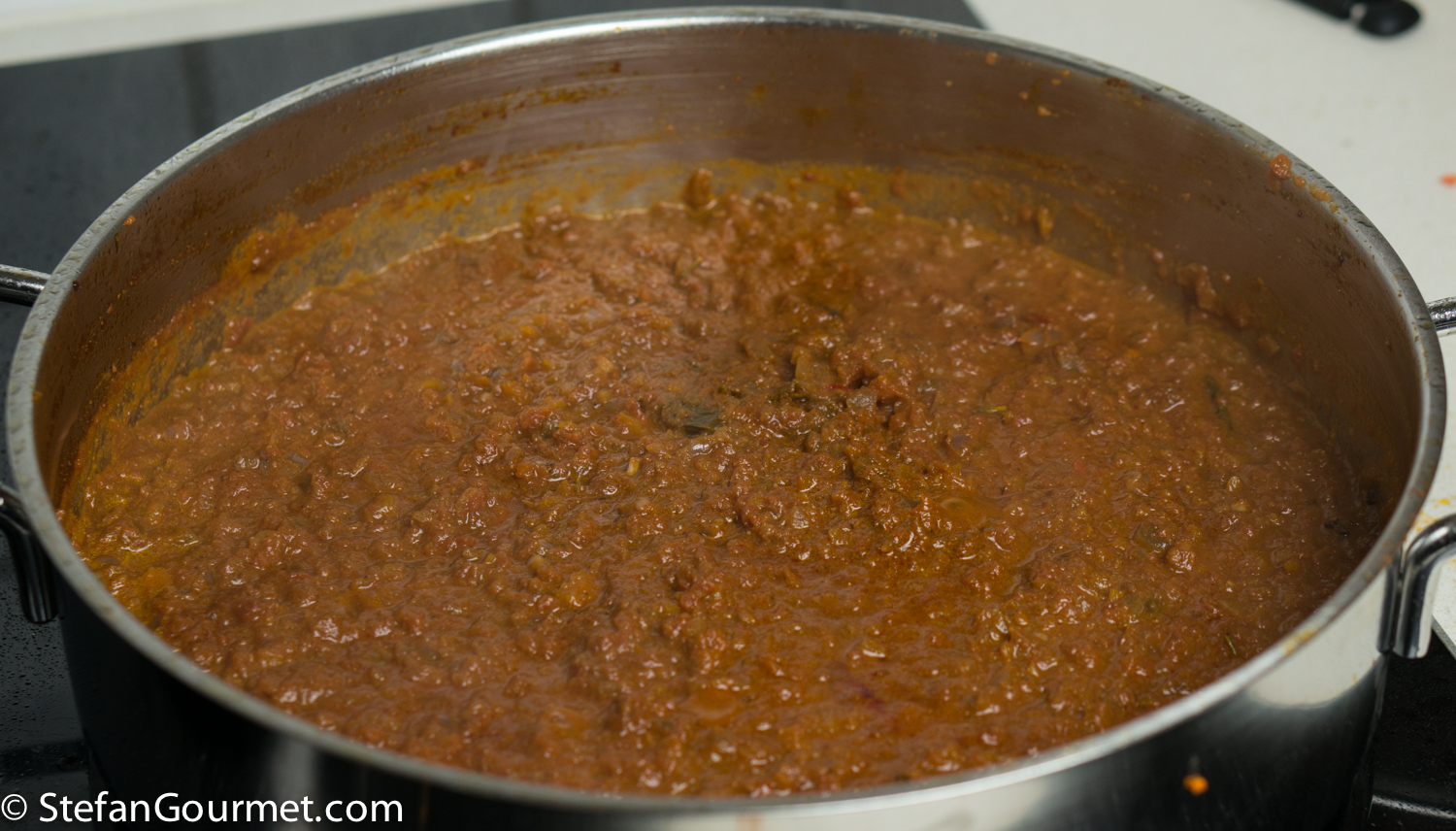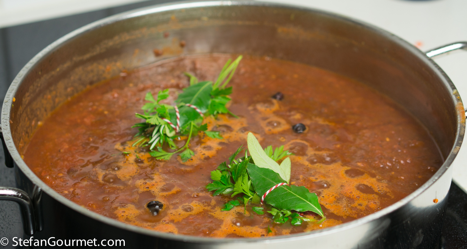 Ragù di Cinghiale is a famous pasta sauce made with wild boar meat and tomatoes from Tuscany and Umbria, served over a sturdy type of long pasta like pappardelle or pici. I’ve already posted a classic recipe for Pappardelle al Ragù di Cinghiale. I thought it would be nice to try a sous-vide version, so there would be succulent morsels of tender boar meat in the sauce. The market here carries wild boar cheeks at a bargain, and so that was the meat I decided to use. Browning small pieces of meat would already cook them through and would eliminate the positive effect of cooking sous-vide. Not browning the meat at all, however, would reduce the flavor as browning adds a lot of flavor. And so I decided to brown the whole cheeks and only then cut them into smaller pieces. That worked very well. Reducing is an important part of most ragù recipes. Since with sous-vide we are cooking the sauce in a vacuum sealed bag, the ragù has no chance to reduce. So we have to make a tomato sauce, reduce it, and then cook it sous-vide together with the meat. Reducing the sauce and the meat together would again eliminate the positive effect of cooking sous-vide. This is not a quick recipe, because reducing the sauce takes about as long as a traditional ragù. And then you still have to cook it sous-vide for 3 days. But it is worth it. This was wonderful and from now on I will use this method for making ragù di cinghiale. I’ve made a triple batch as the ragù keeps well frozen or in the refrigerator after it has been cooked sous-vide.