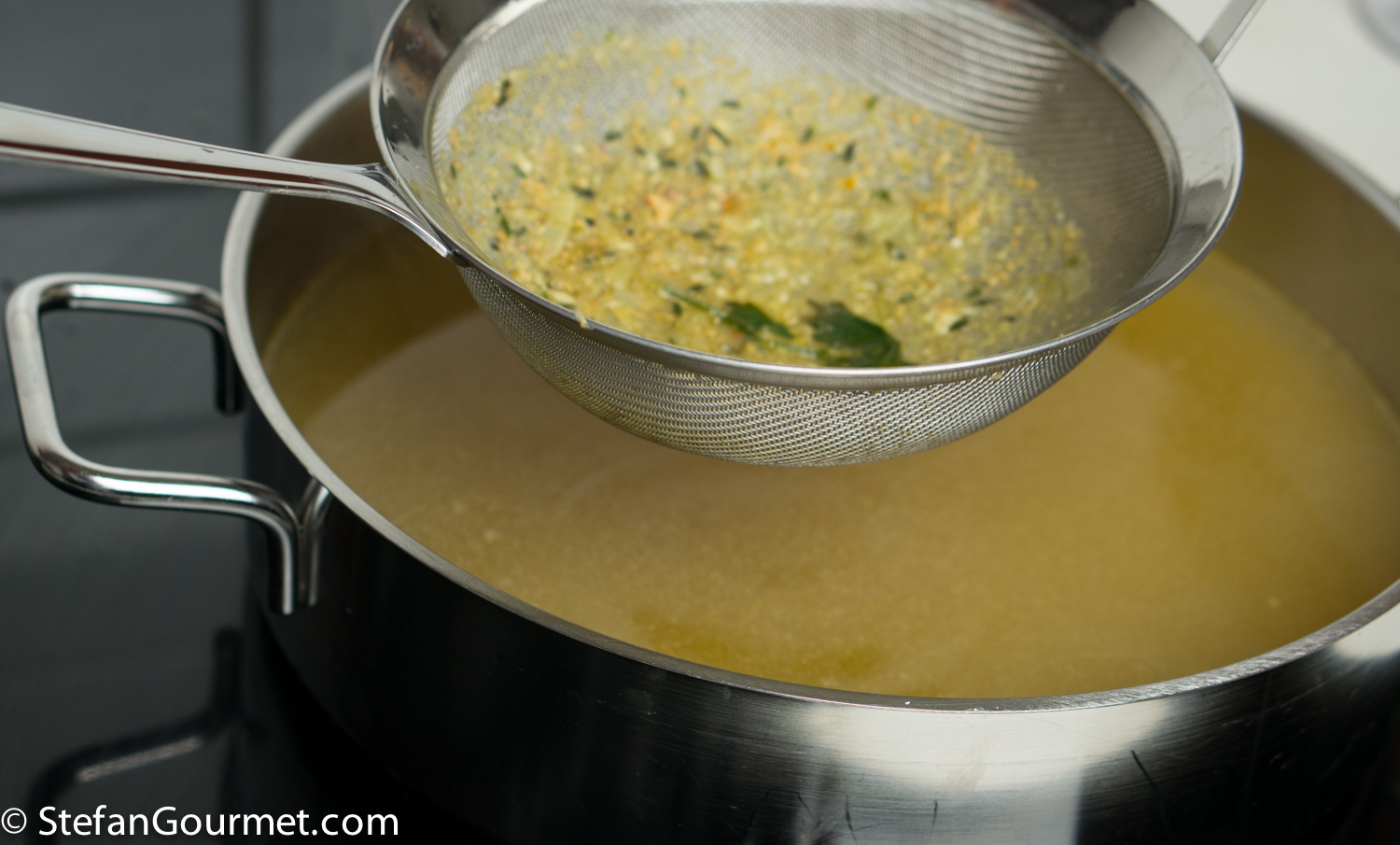 Strain the stock first with a colander…