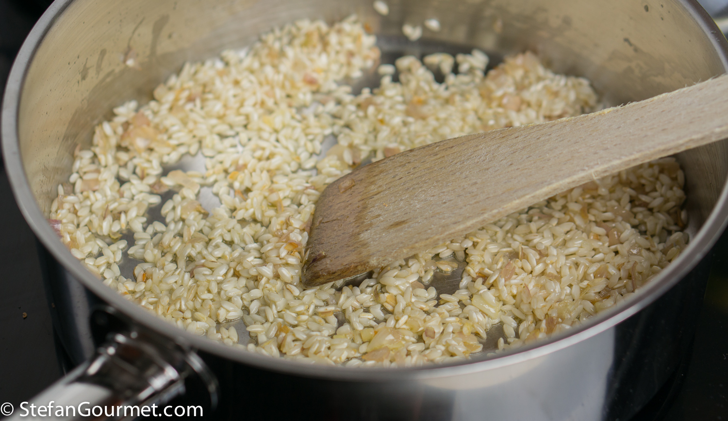 When the shallot is translucent, add 130 grams (2/3 cup) risotto rice.