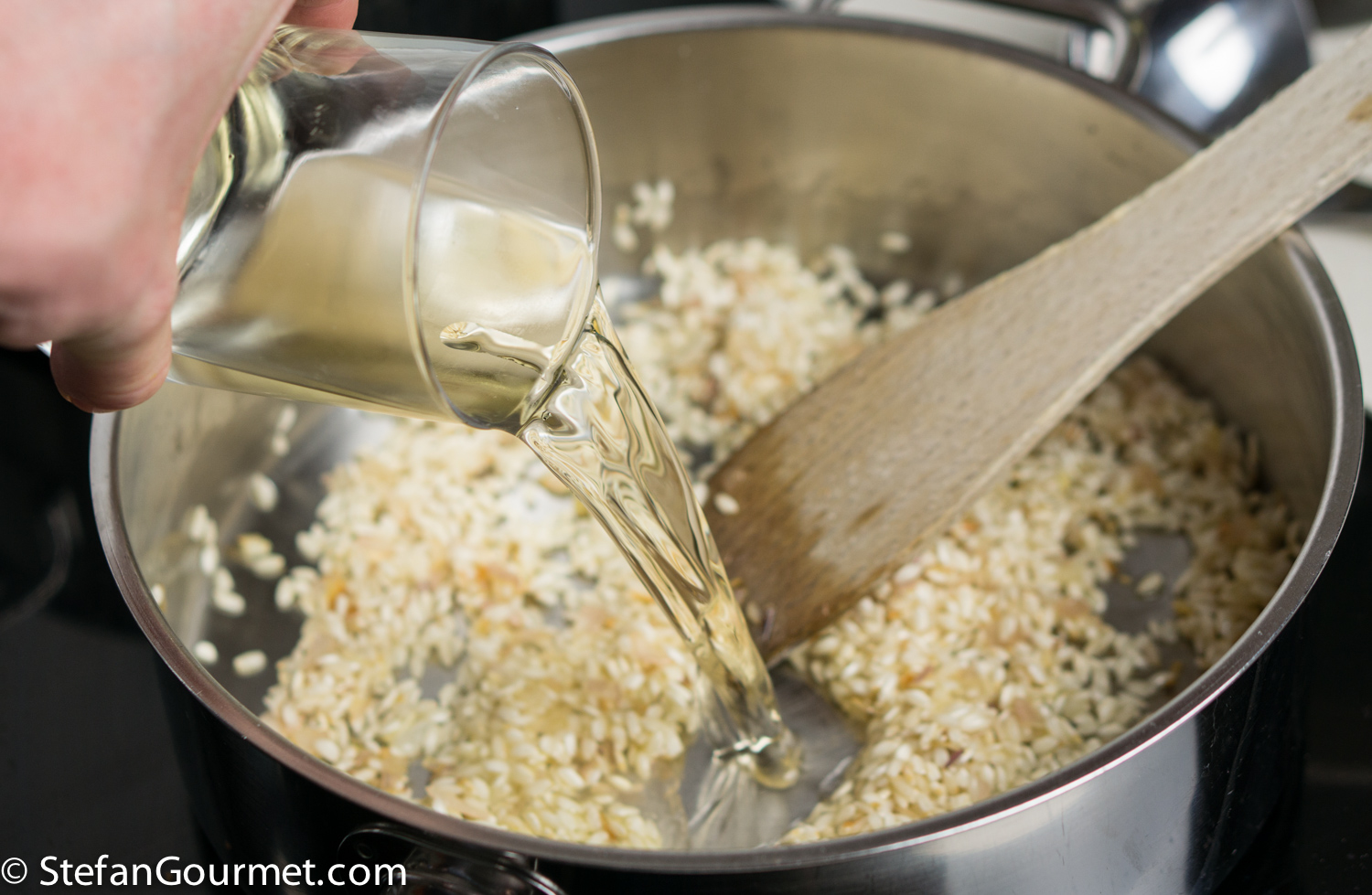 Add 80 ml (1/3 cup) dry white wine, and stir over medium heat until it has evaporated.
