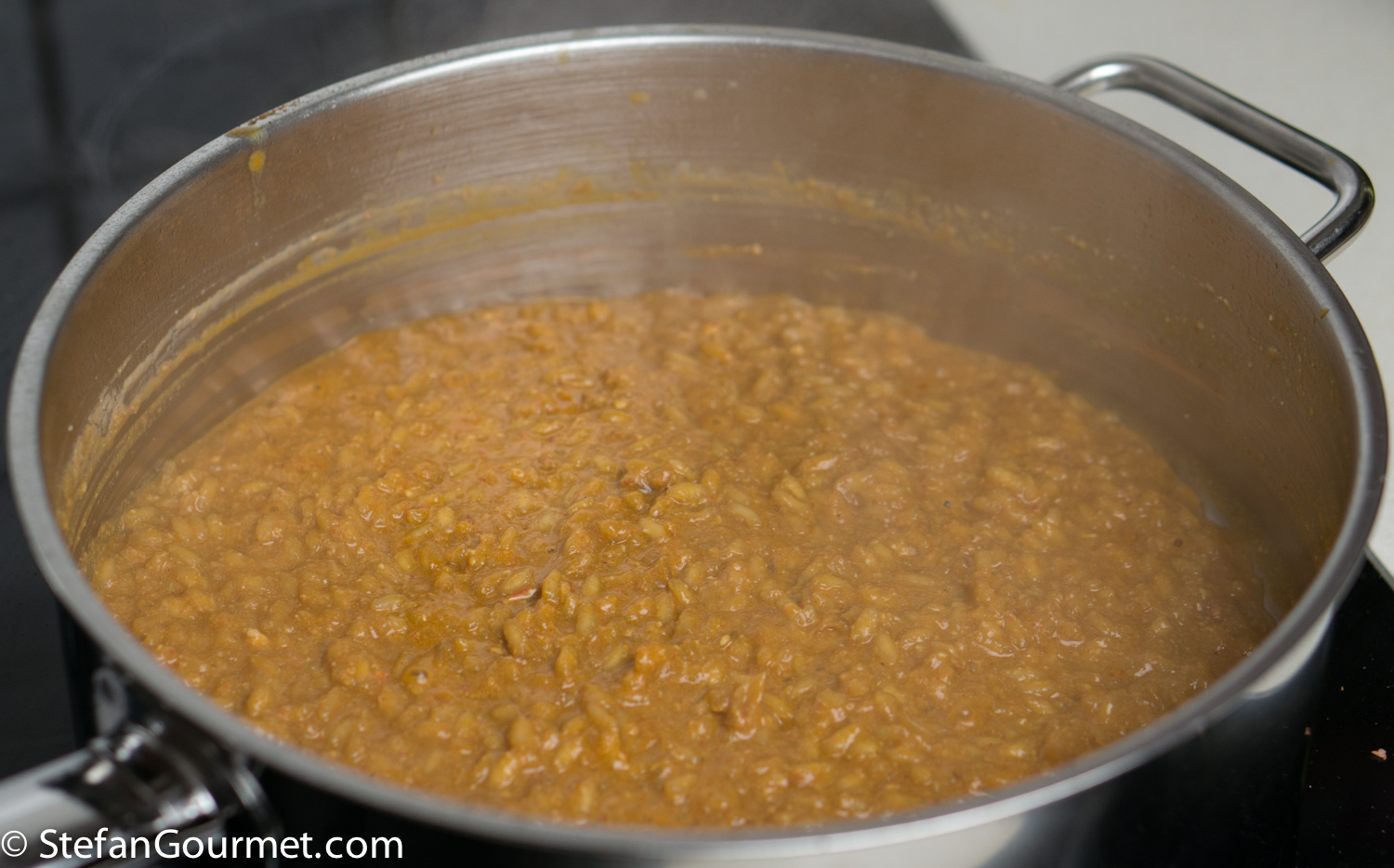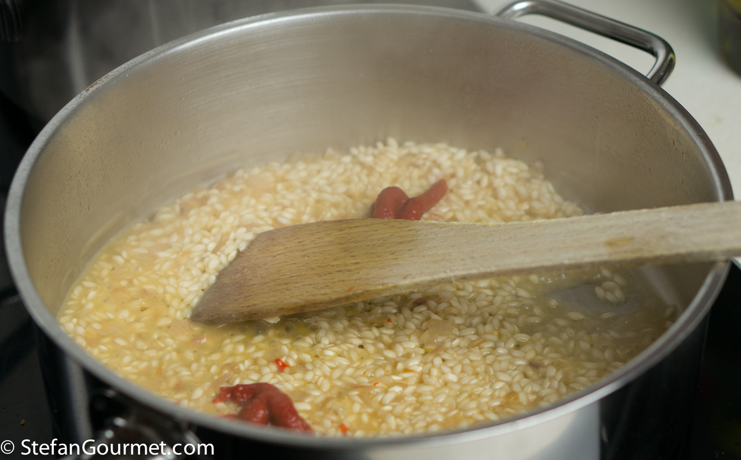 Everything up to here is preparation that can be done earlier on the same day. You could also cook the risotto until it is almost done and the reheat it when it becomes time to serve, but for the best texture risotto should be made right before it is eaten.