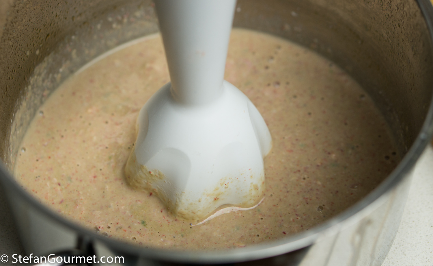 When you have only about 125 ml (1/2 cup) of stock left, add the tomalley, claw tips and leg meat, and puree with an immersion blender.
