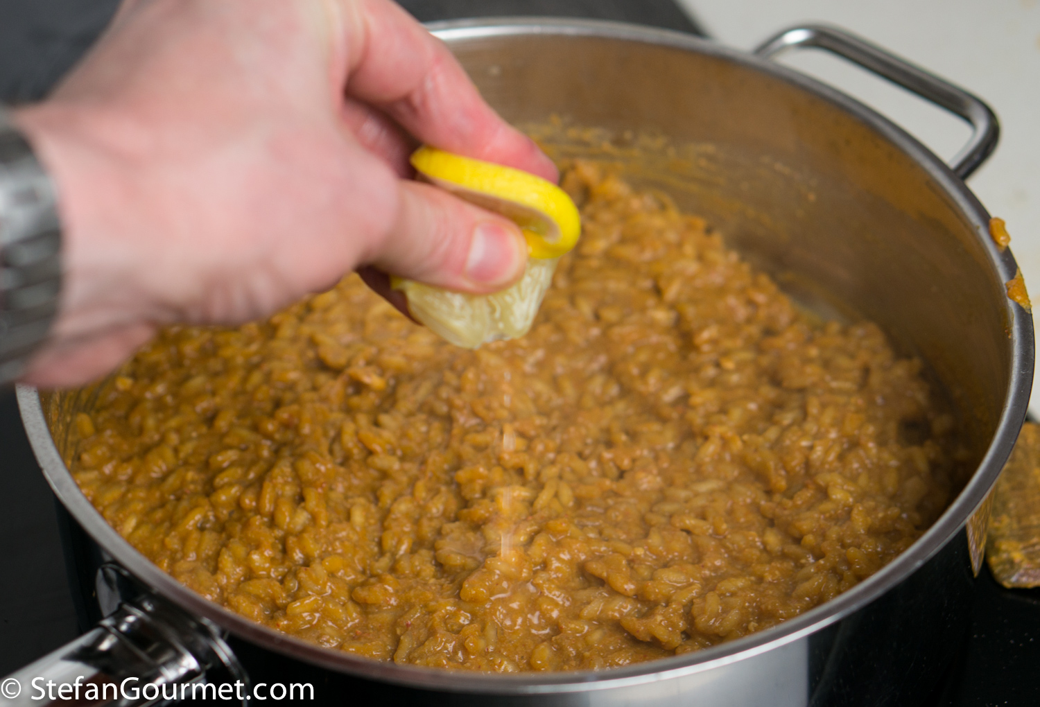 Add some freshly squeezed lemon juice to taste. This only serves to brighten up the flavor a little. By adjusting the amount of lemon juice, you can make sure the risotto will work with the acidity of the wine that you selected to go with the dish.