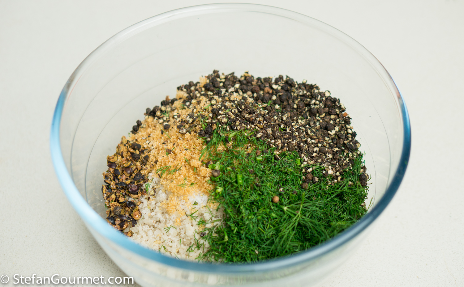 Combine the ingredients to cure the salmon (salt, sugar, dill, juniper berries, peppercorns) in a bowl.