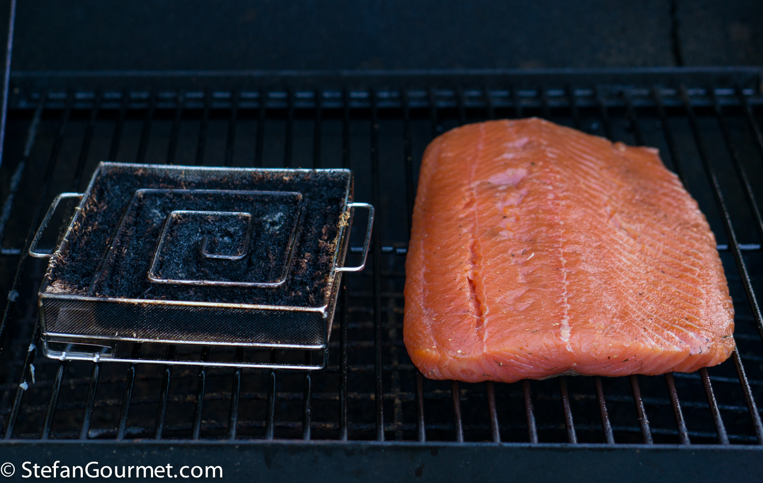 Fill up a cold smoke generator with sawdust and light it. Put it in a suitable place (a grill with a cover is perfect) together with the salmon.