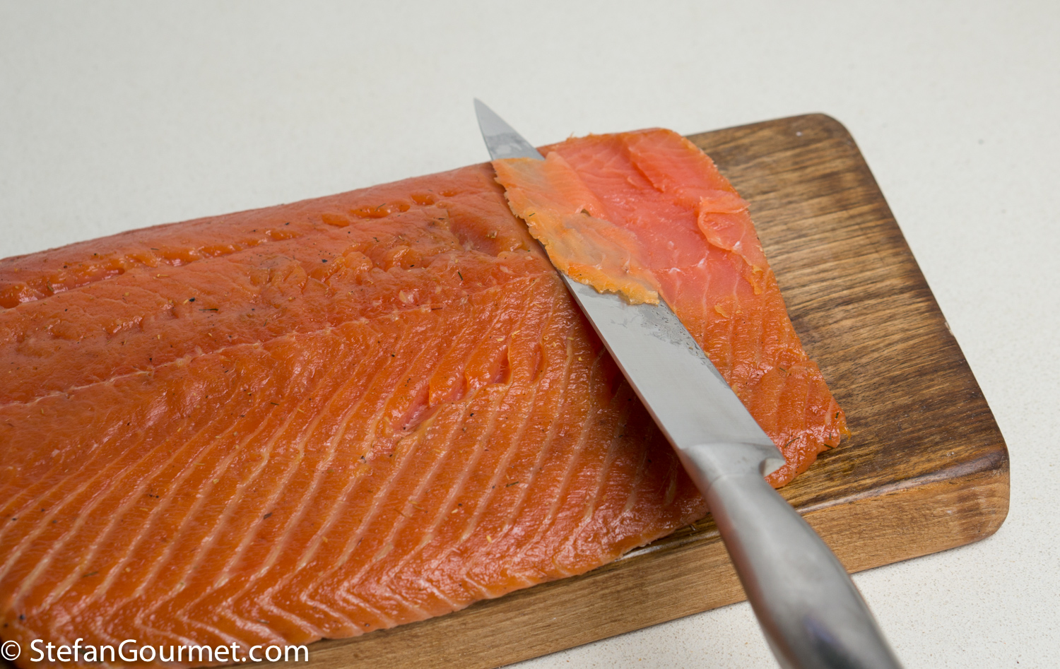 Slice the salmon thinly with a sharp knife.