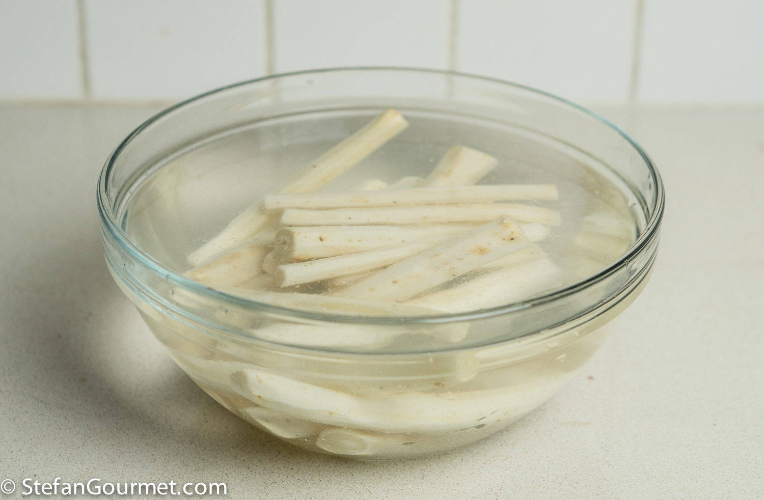 Cut the salsify into 15 cm (6″) lengths and put them in a bowl of water with some lemon juice to prevent them from discoloring.