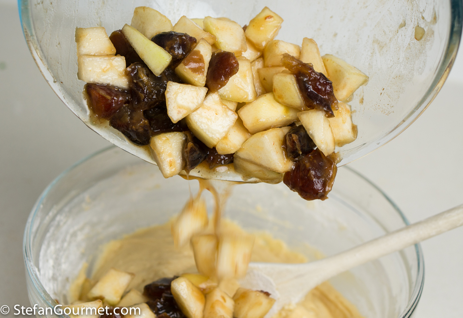 Chop the dates and put them in a bowl. Peal and core 2 pears and cut into chunks, add to the same bowl. Add 80 ml (1/3 cup) of cognac, stir, and allow to macerate for half an hour while you make the batter.