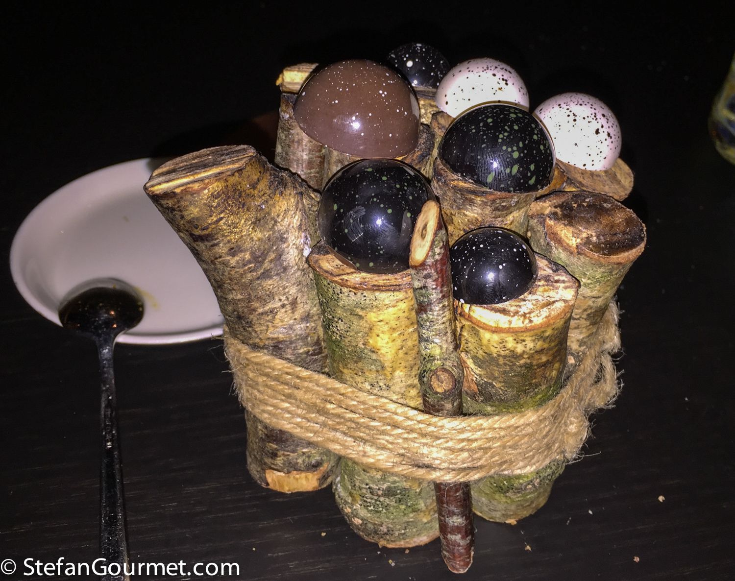 With the coffee came chocolates with ‘flavors from the forest’: dark chocolate with mushrooms, fir tips with salty caramel, white chocolate with alderflower, and juniper berries with lemon.