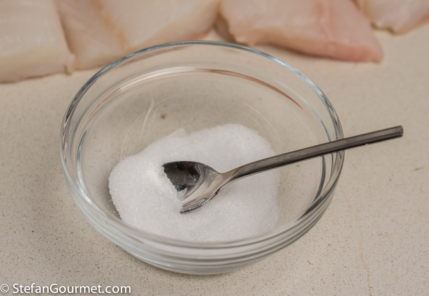 If you want to be very precise about curing the fish and have very accurate scales, first weigh the fish and then calculate 1.4% of that weight for the salt and 0.6% for the sugar.