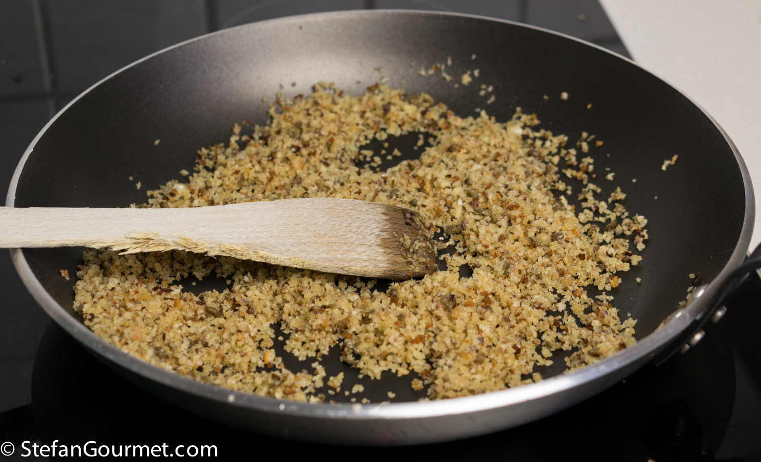 Sauté 1/2 cup (120 ml) of large dry breadcrumbs in olive oil together with the anchovy-caper-garlic mixture until the breadcrumbs are golden, then turn off the heat.