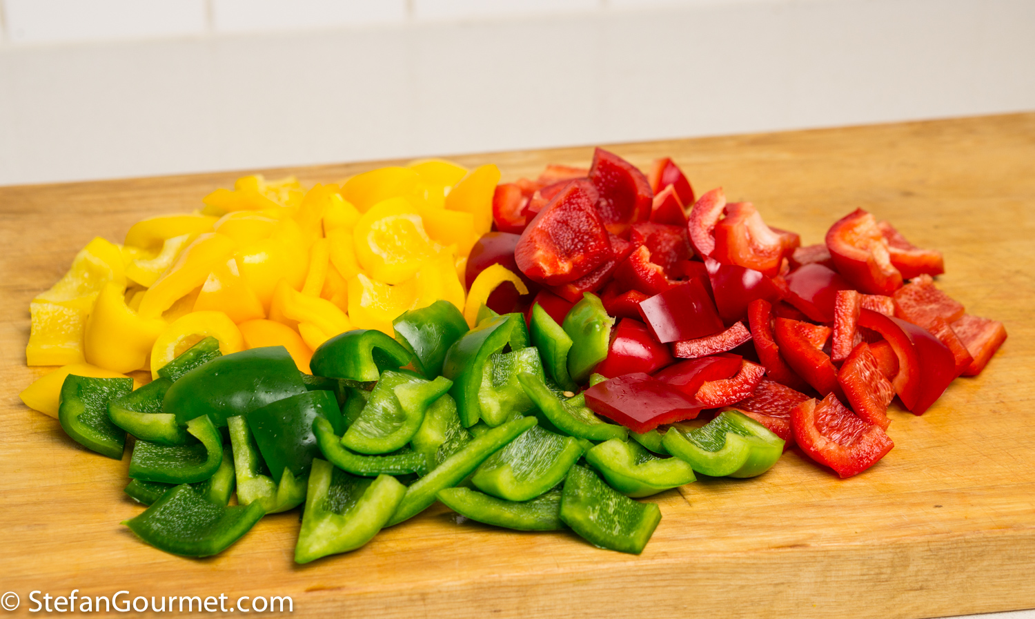 Clean 2 red, 2 yellow, and 2 green bell peppers and cut them into 3 cm (1 inch) chunks.