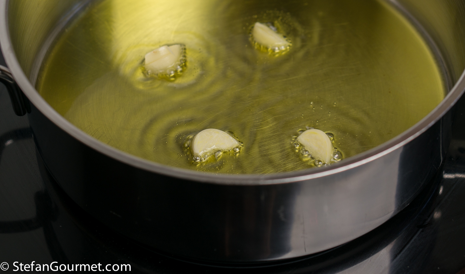 Heat a generous amount of olive oil in a frying pan. Add 2 garlic cloves, cut into halves.