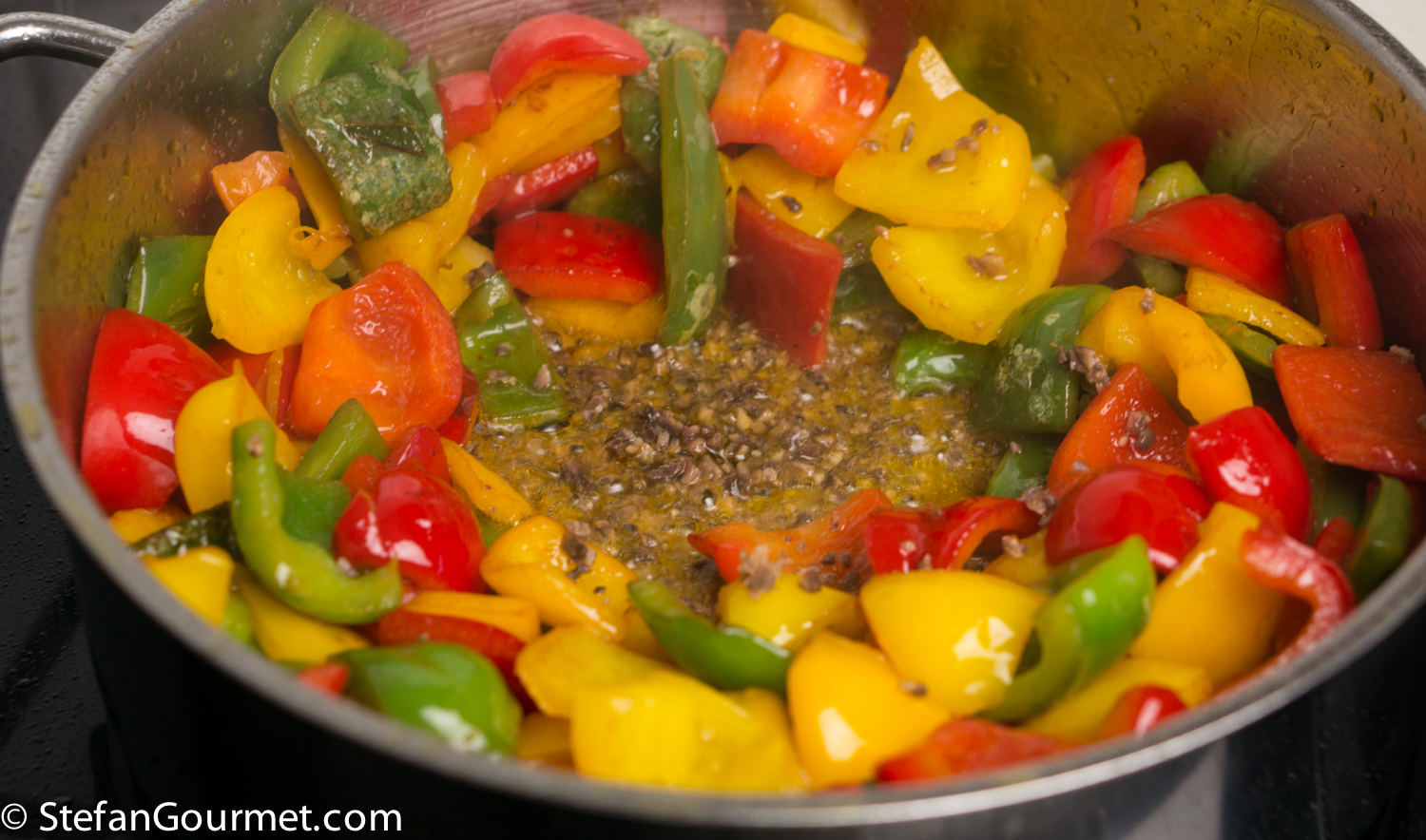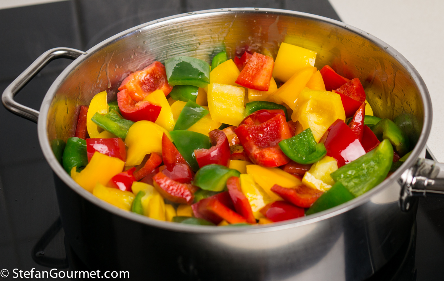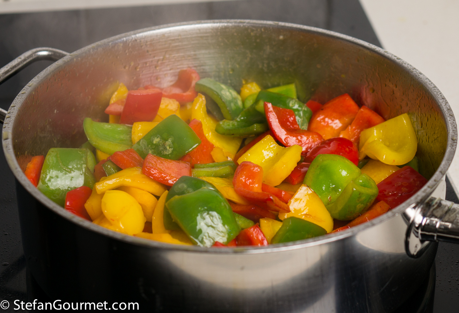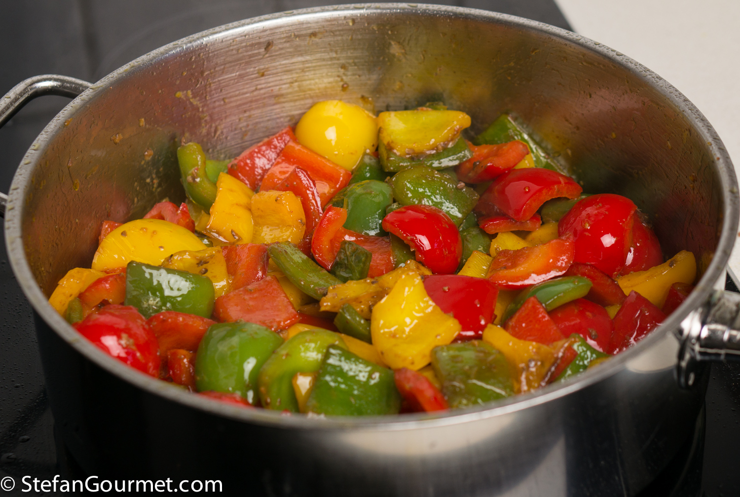 Cook the bell peppers over low heat, stirring regularly, for about 30 minutes.
