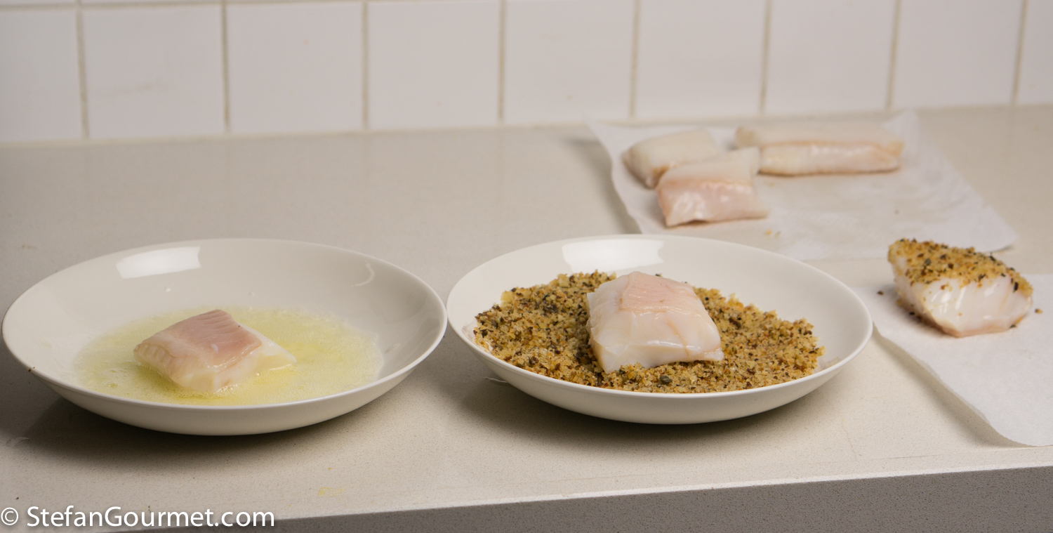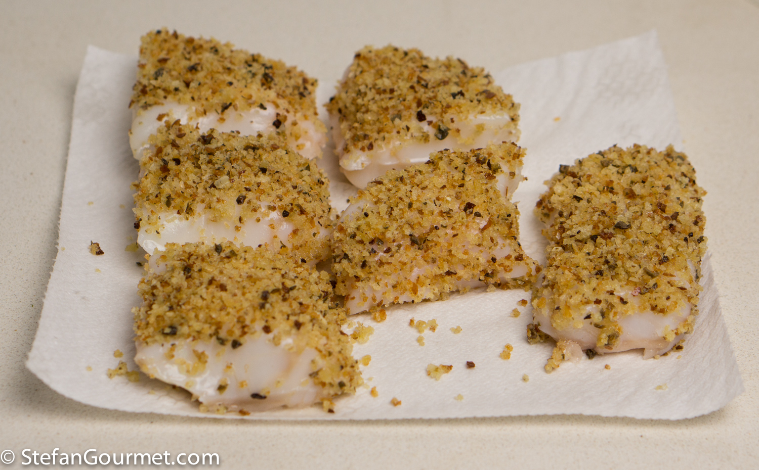 Do this only on one side, and arrange the fillets on a plate or a piece of kitchen paper on the other side (so the breaded side is on top).