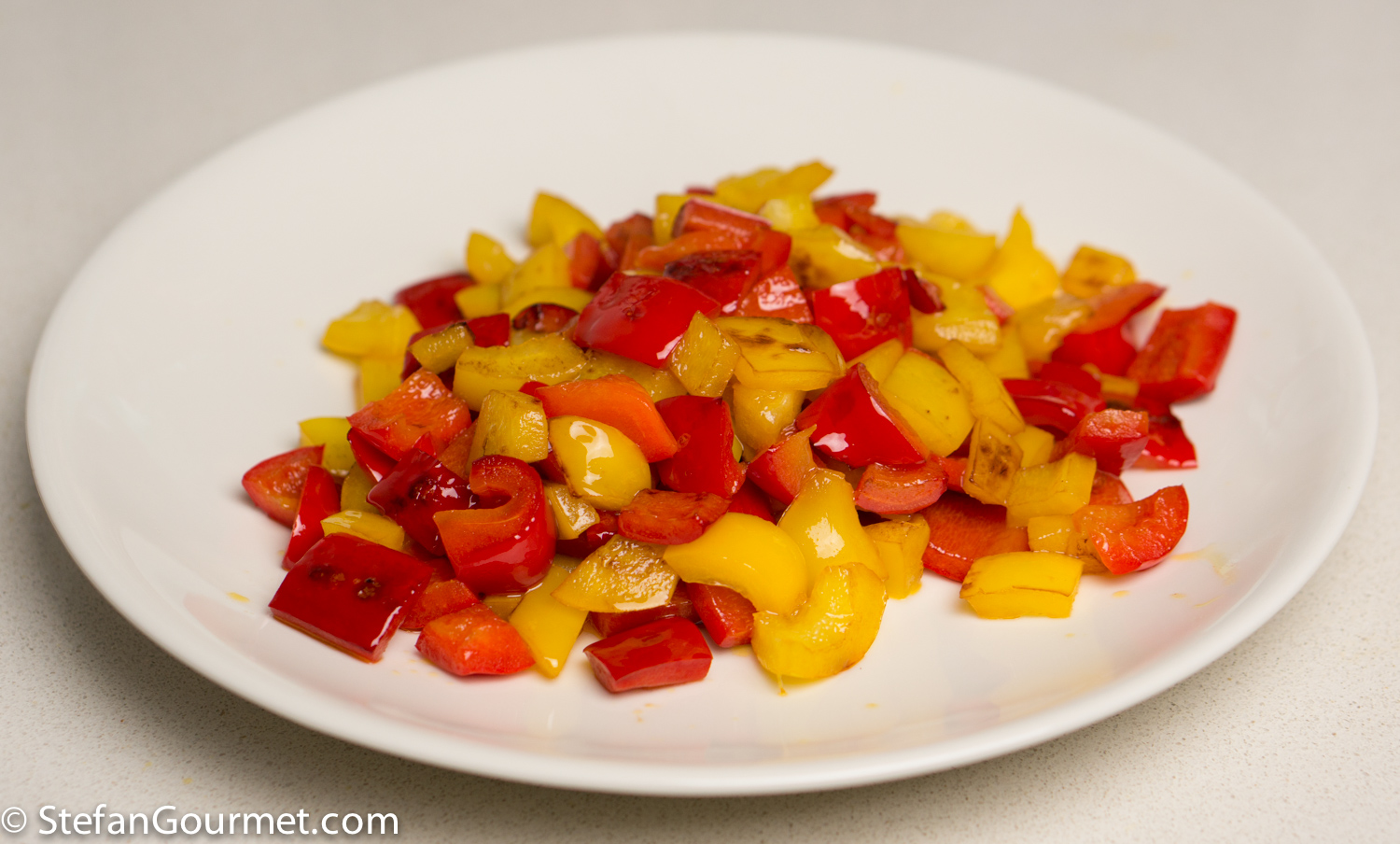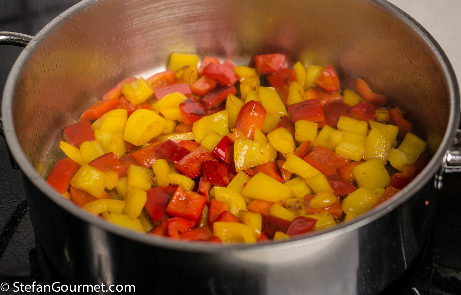 In the meantime, heat 2 tablespoons of olive oil in a frying pan. When the oil is hot, add a red and a yellow bell pepper, diced. Stir over high heat until the bell pepper starts to color, then turn off the heat.