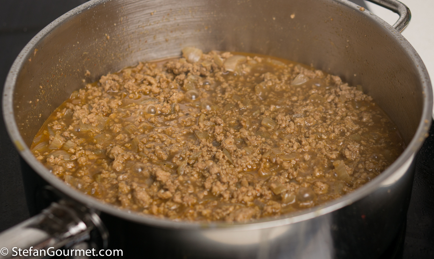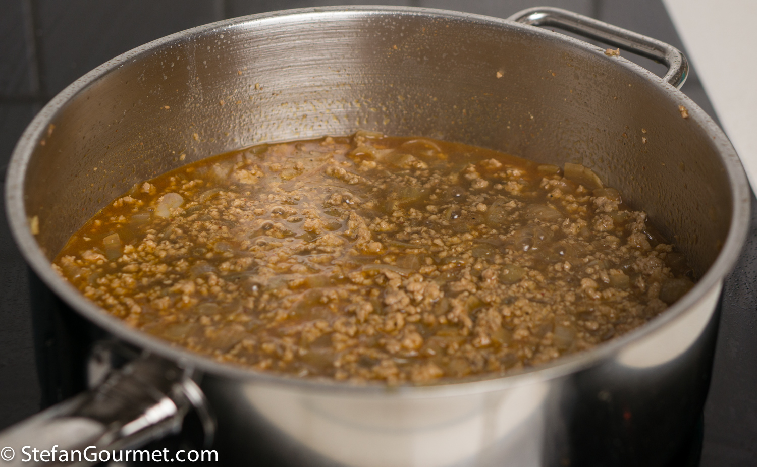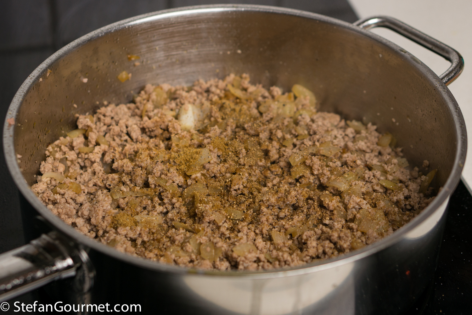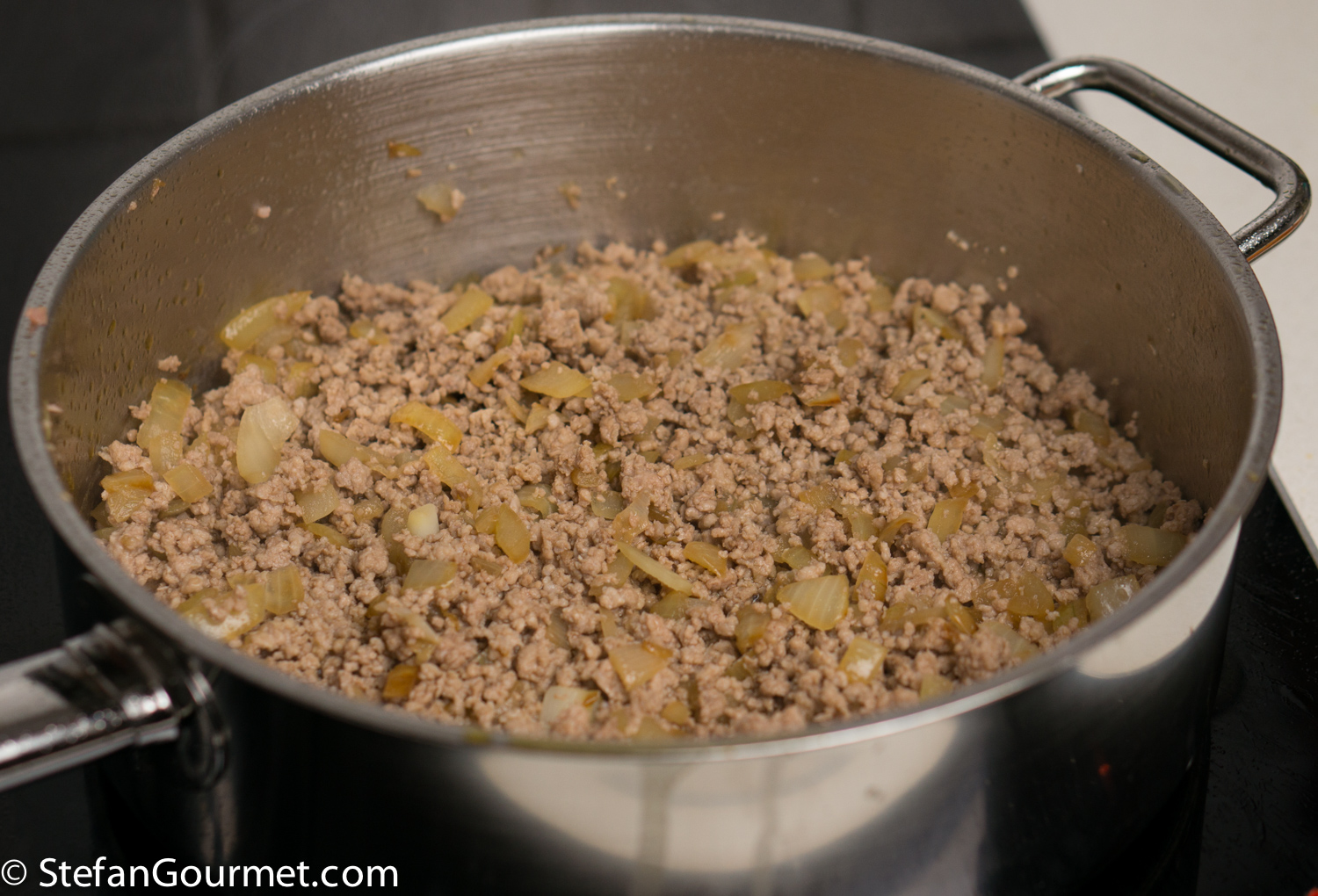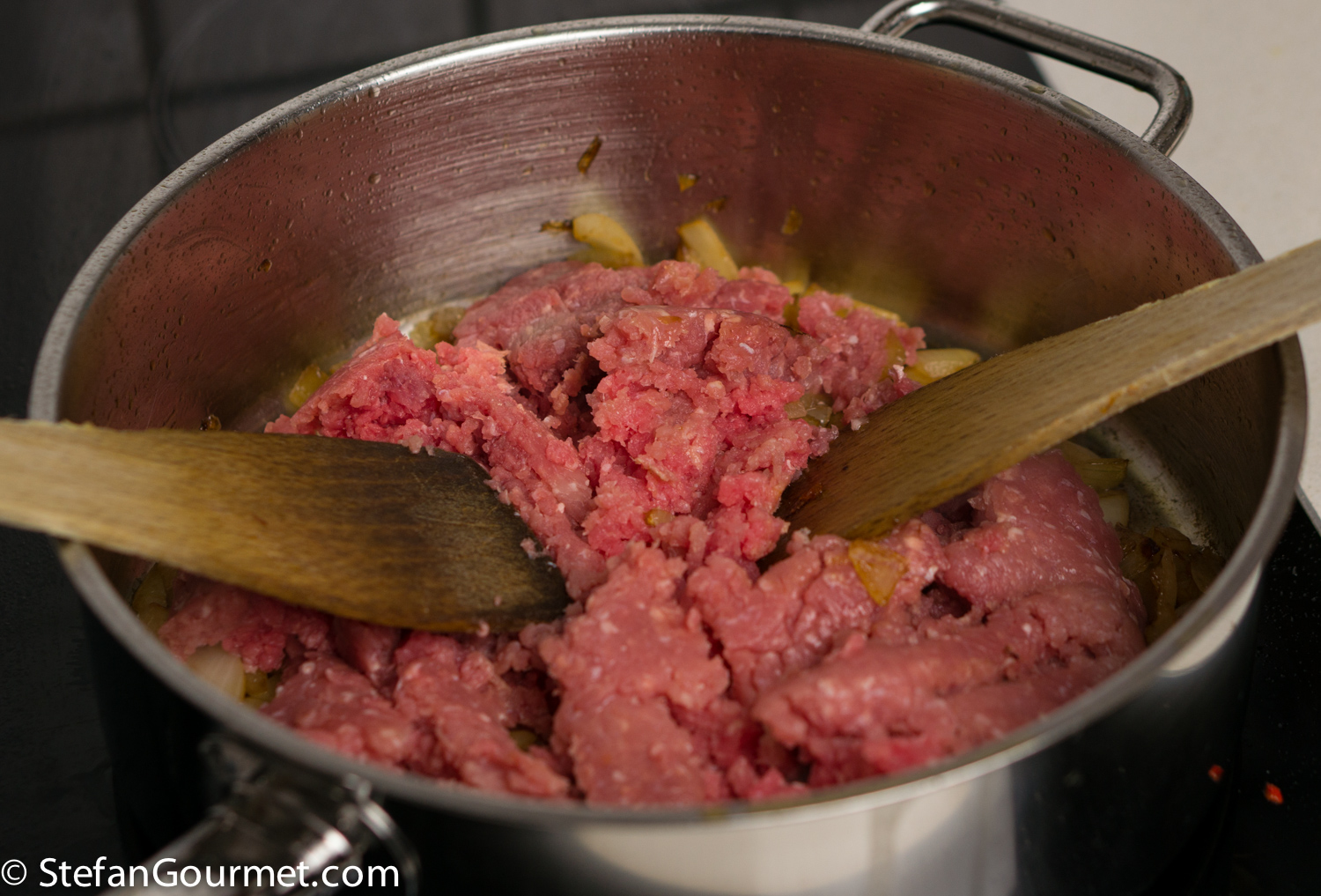When the onion is soft, add 450 grams (1 lb) of ground beef. Cook over medium-high heat, stirring and breaking up the meat with wooden spatulas…