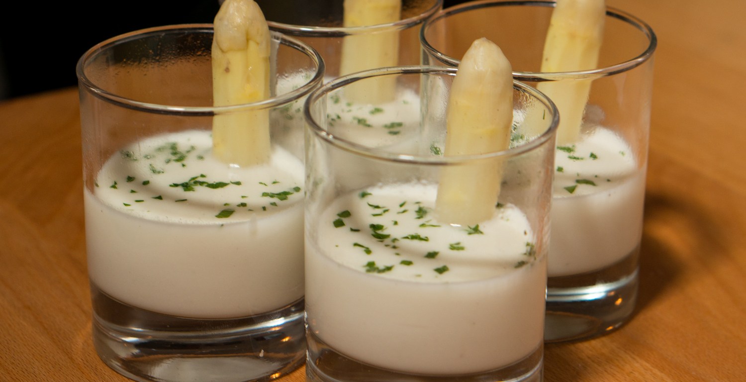 Serve the soup in tumblers. Arrange an asparagus tip in each tumbler, and add the hot asparagus soup carefully (to keep the tumbler clean).