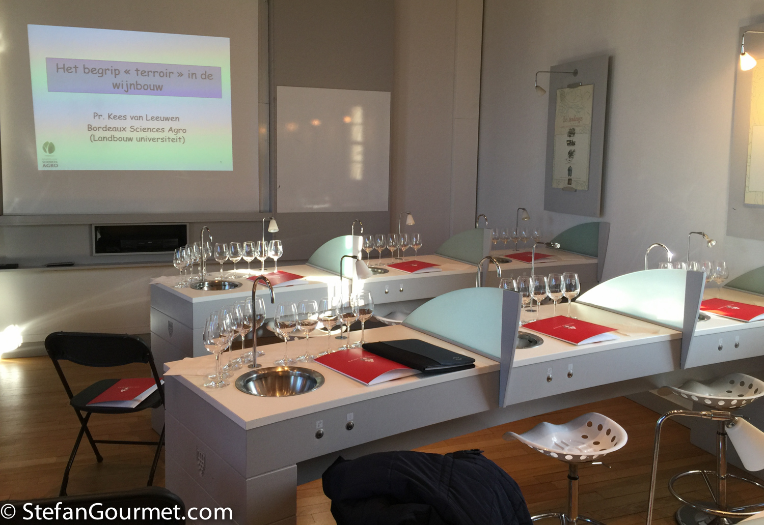 The following morning we had a lecture from Kees van Leeuwen, professor of viticulture at Bordeaux Sciences Agro, which is part of Bordeaux University’s Institut des Sciences de la Vigne et du Vin. Kees van Leeuwen conducts research on the concept of terroir in viticulture. He started by explaining the difference between ‘brand wines’ (wines that often express a grape variety and are as much as possible the same every vintage by blending different terroirs) and ‘terroir wines’ (wines from a specific terroir that express the terroir and the vintage). Then he told us about a research project at Château Cheval Blanc in which he measured the influence of different factors (soil type, grape variety, and the vintage i.e. weather) on the wine over a period of eight years. The results were very interesting, as the vintage turned out to be more influential than expected. In short, a dry year in Bordeaux is a good year, but a wet year isn’t necessarily a bad year. The impact of terroir on wine was then illustrated by tasting five wines from five different terroirs within Saint-Émilion, all of the same vintage. The terroirs were wet sandy soil (Château Vieux Longa), dry sandy soil (Château Pindefleurs), chalk plateau in St-Émilion (Château Haut-Fayan), chalk plateau in Puisseguin (a bit cooler, Vieux Château Pelletan), and slopes with a southern exposure in Saint-Émilion (Château Larcis Ducasse, 1er Grand Cru Classé). It was a very interesting lecture indeed, and tasting the wines helped to grasp the concept.