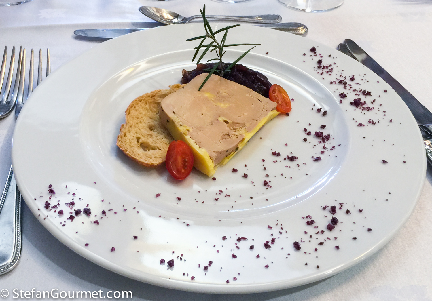 We then tasted the wines with a lunch, starting with the 2012 vintage of Château Guibeau with a terrine of foie gras with red onion compote and wine-impregnated salt. The pairing of a red Puisseguin Saint-Émilion with foie gras really worked because of the onion compote. We also tasted the premium wine Château Guibot La Fourvieille of vintages 2012 and 2007, the latter being at peak maturity.