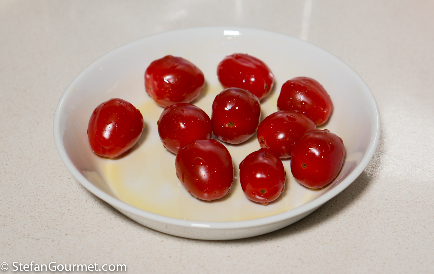 If your plates are oven proof, it is a good idea to preheat them in the oven with the tomatoes.