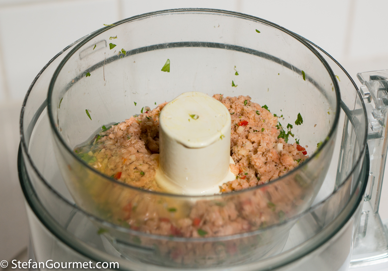 In the meantime, combine the shrimp, coriander, lime zest, chilli, and 1 minced clove of garlic in the bowl of a blender.