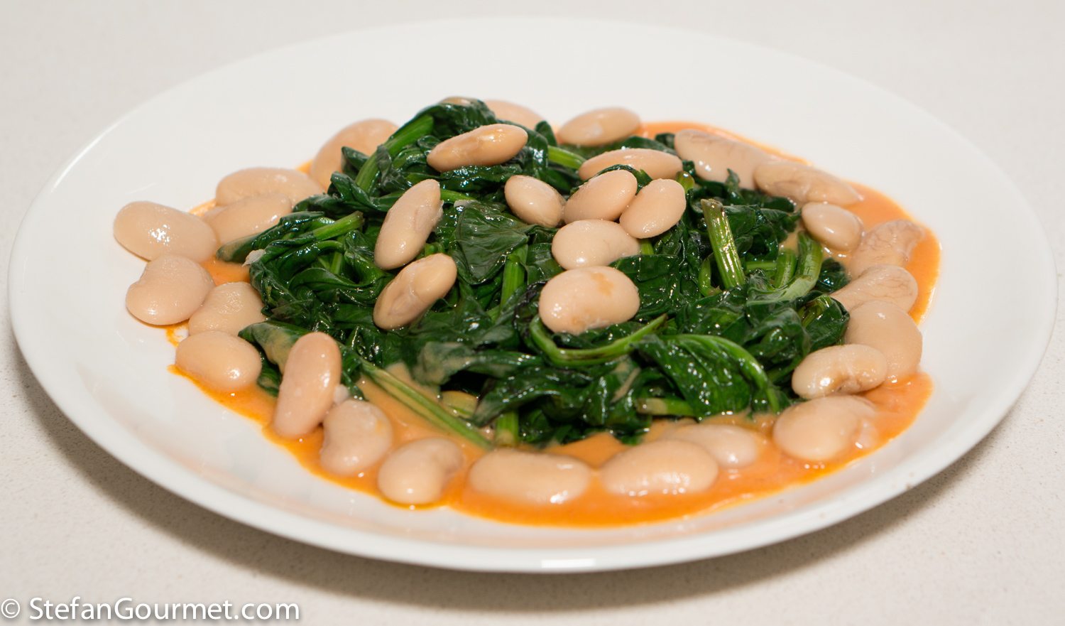 Arrange the beans on top of the sauce, and scatter a few on top of the spinach if you run out of space.