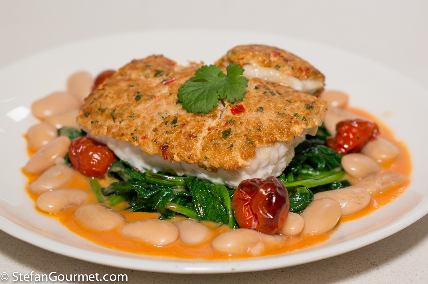 On Ocean Drive in Miami Beach I had a very nice dish at A Fish Called Avalon, crab-crusted grouper with steamed spinach, giant white beans, roasted teardrop tomatoes, and a madeira beurre blanc. This is the only dish from my recent trip to Florida that I liked so much that I wanted to try and make something similar at home. The first problem is that grouper is not available in the Netherlands. And so I opted for the quite similar wolffish, but halibut would work too. The second problem was that although crab is usually available, I couldn’t find any after I had already purchased the other ingredients. And so I chose North Sea shrimp instead. (These tiny shrimp are cooked fresh in seawater as soon as they are caught and have more flavor than their larger cousins. You can substitute with other shrimp, raw or cooked doesn’t matter much.) The end result was very nice, although I certainly wouldn’t claim it to be a copy of Avalon’s dish. Also because I made some other changes as well. There will be a follow-up post in which I will use crab as well as madeira.