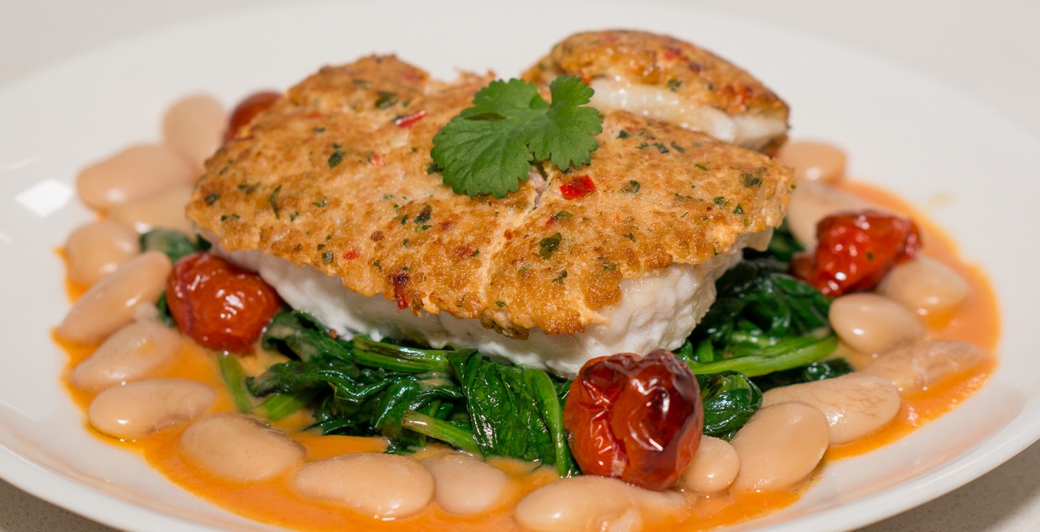 The crusted fish looks truly delicious.