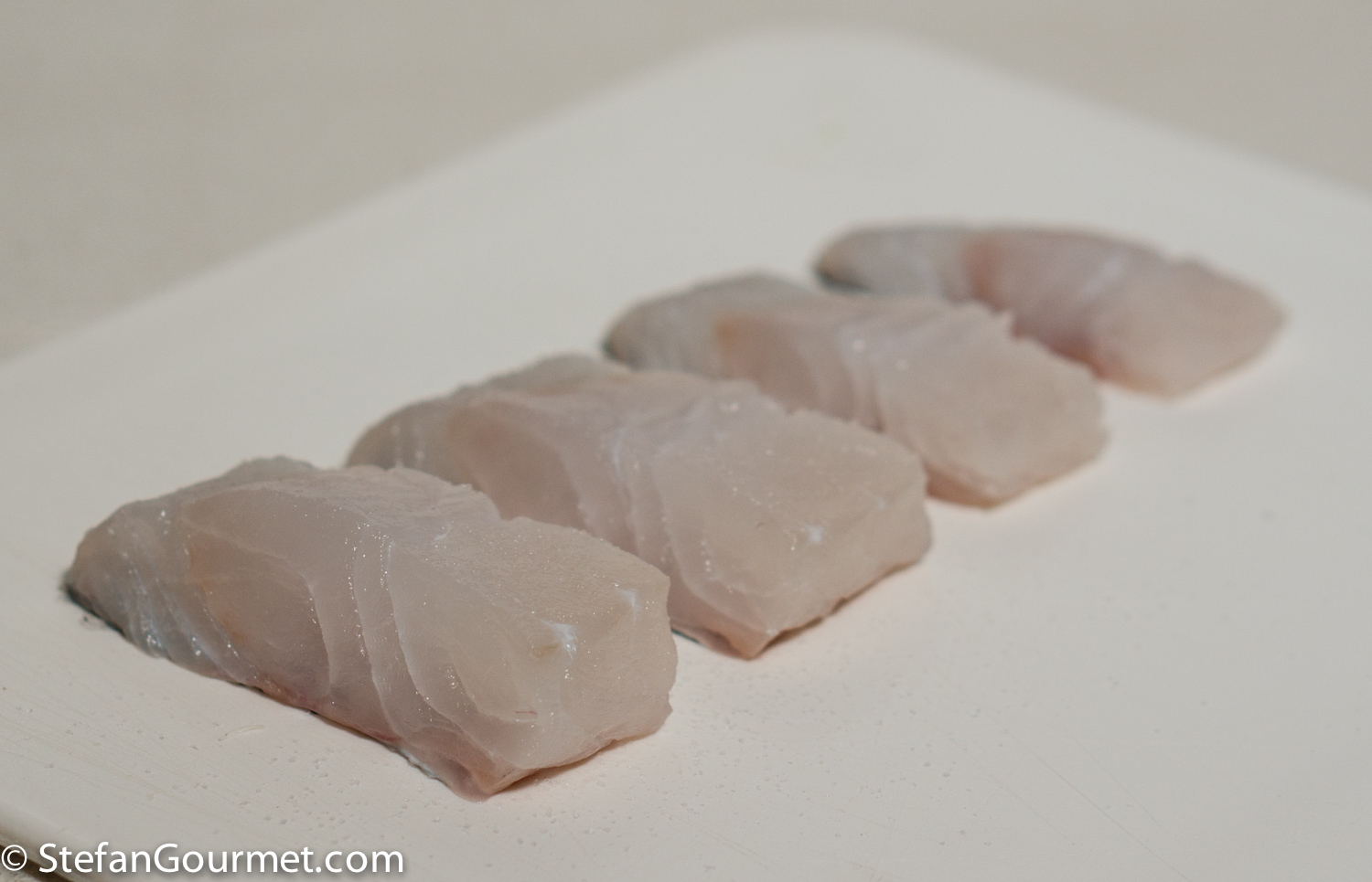 I started with a nice piece of cod loin, cut it into 4 pieces, seasoned it with salt, and allowed to salt to cure the fish for an hour in the refrigerator.