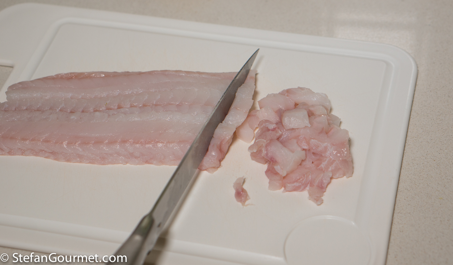 When the parsnip puree has cooled off, cut 300 grams of fish fillet into small pieces.