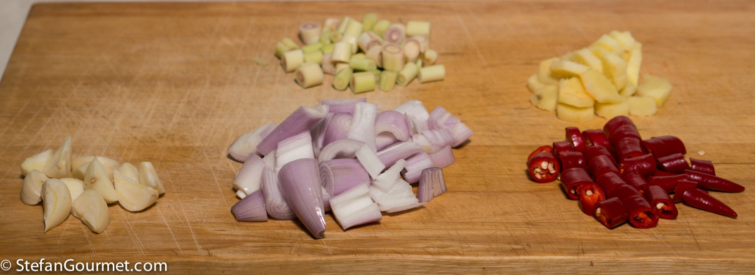 Roughly chop 25 grams of garlic, 100 grams of shallots, 40 grams of ginger, 40 grams of lemongrass, and 30 grams of red chillis.