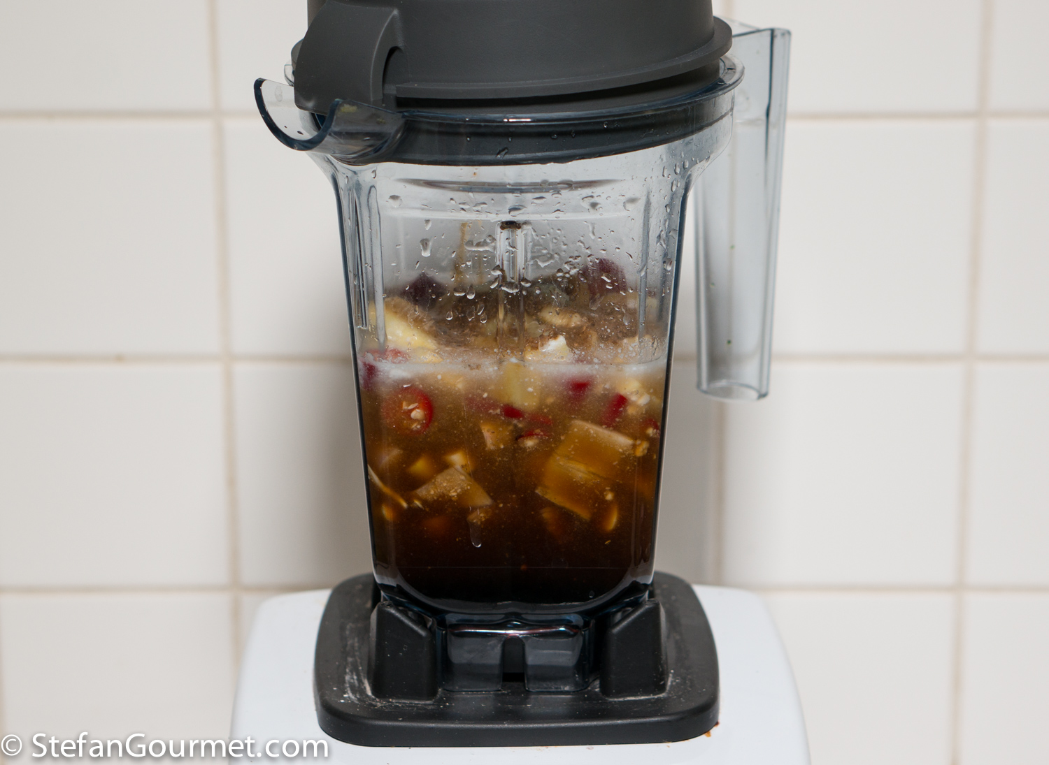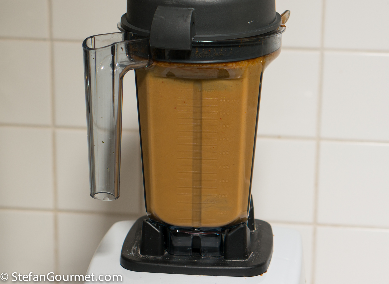 To make the peanut sauce, put the marinade in a blender together with the reserved coconut cream and 100 grams of roasted peanuts.