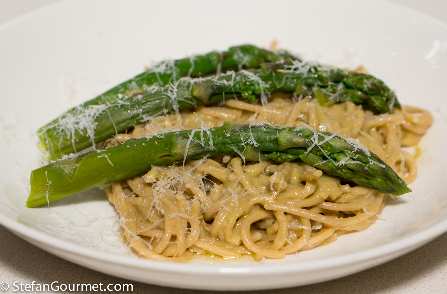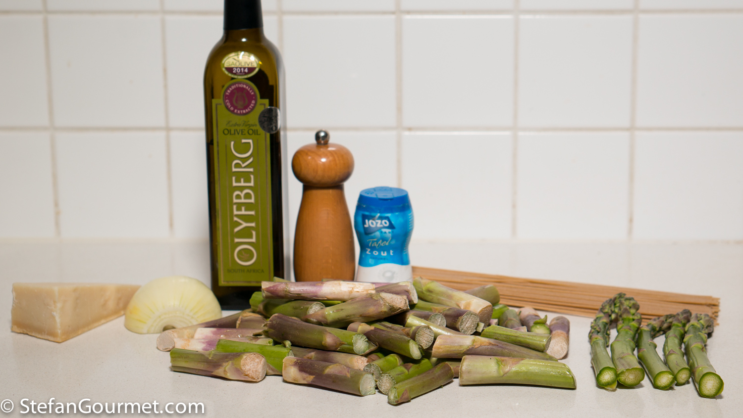 We love green asparagus, especially when they are grilled on the BBQ, but every time I prepare them, it bothers me to discard the ends. About 40% of the weight is discarded that way. And so I wanted to experiment to see whether something edible could be made from green asparagus ends. I decided to pressure cook them (regular boiling would also work, but would take twice as long), then blend them, and finally sieve them to get rid of any tough fibers. I used the resulting thick asparagus stock to dress spaghetti. The result was tasty enough, but I was a bit disappointed that the asparagus flavor was quite faint. Perhaps I should not have chosen wholewheat spaghetti, but pasta with less flavor. Still at least this is a way to reduce waste. If you don’t have enough asparagus ends from eating them once, you can of course freeze the ends until you have saved up enough.