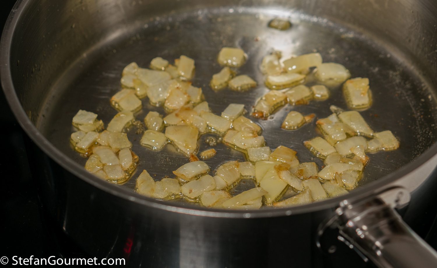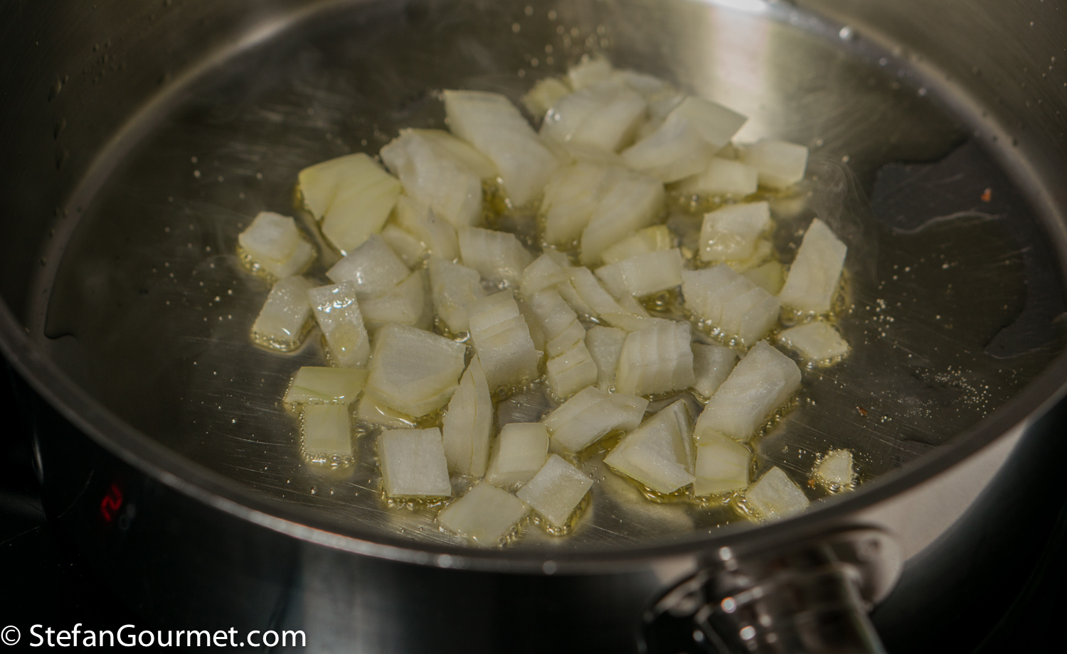 Meanwhile, heat a tablespoon of olive oil in a frying pan and add 50 grams of chopped onion.
