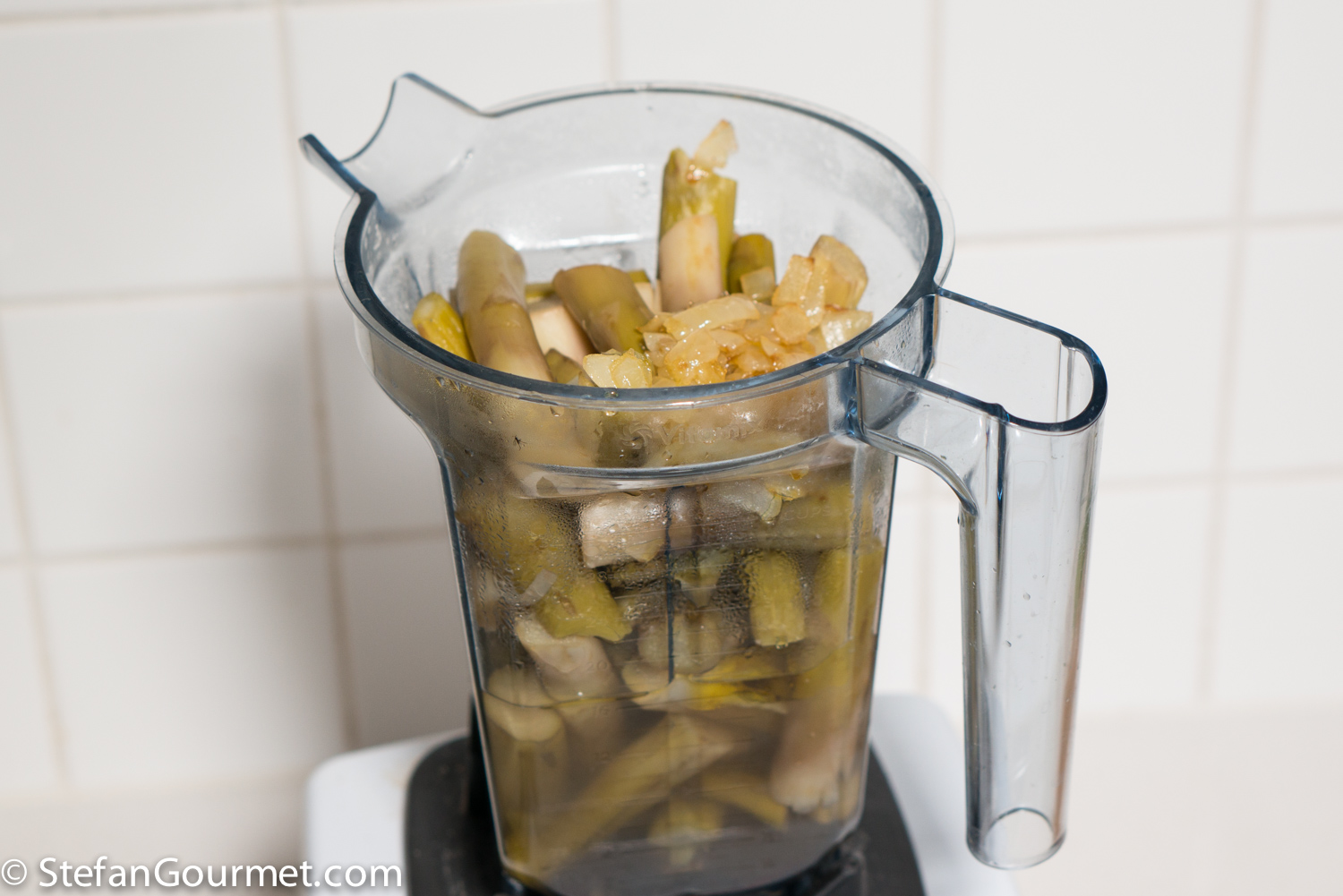When the asparagus are cooked, put them in a blender with all the liquid from the pot, together with the onions.