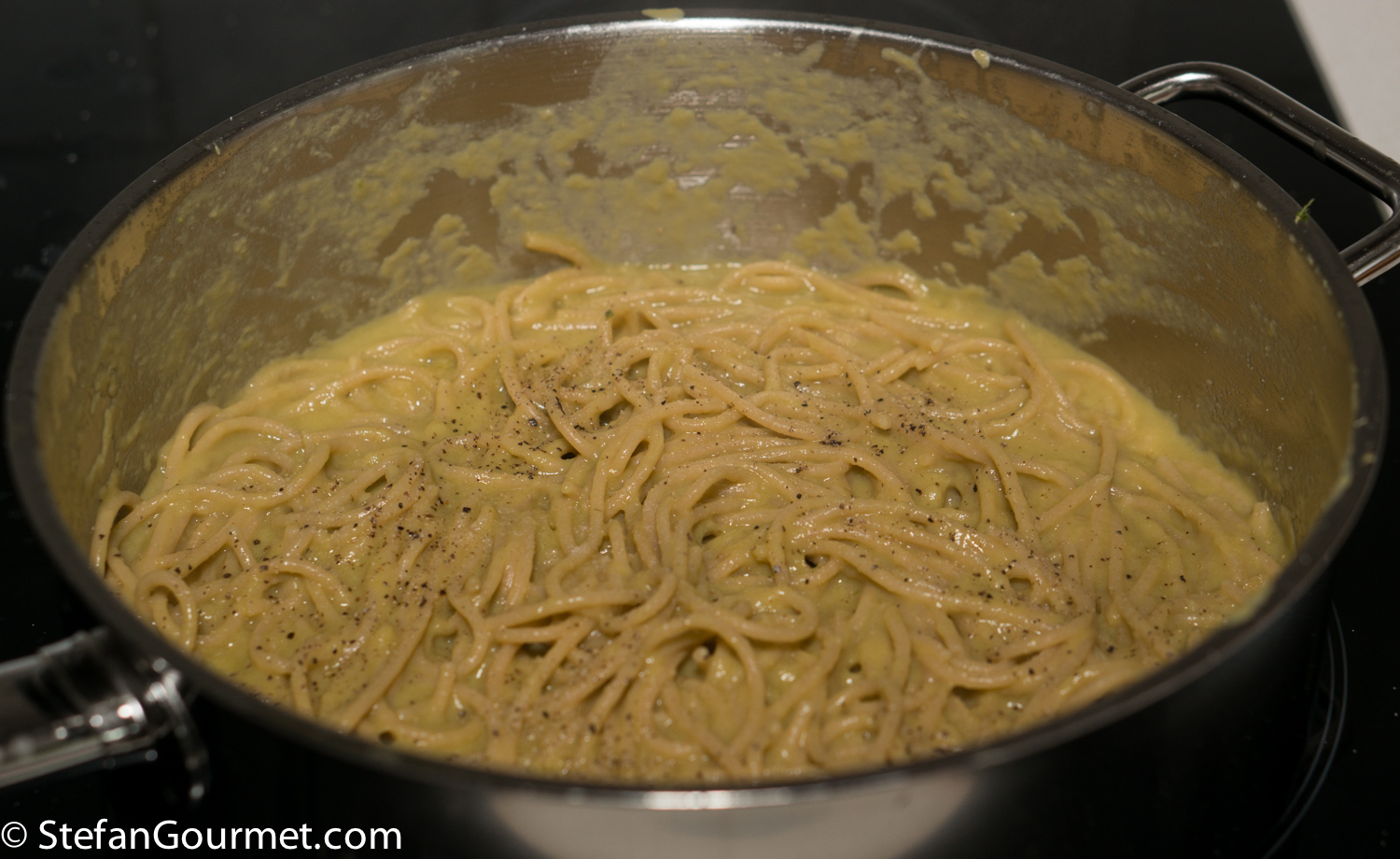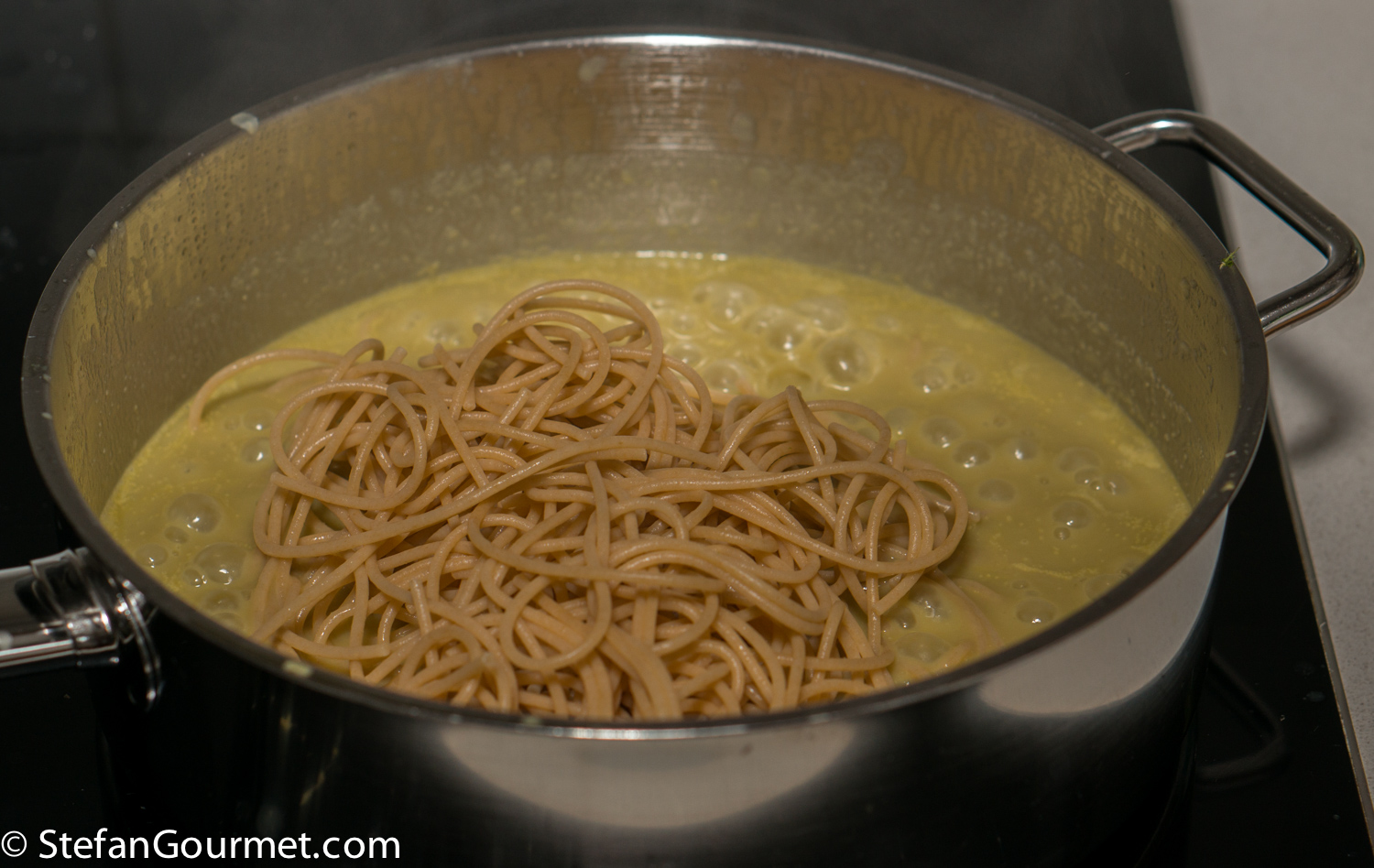 Finish cooking the spaghetti in the asparagus stock over high heat, gently stirring constantly. When the spaghetti is cooked, the asparagus stock should have reduced to become a thick sauce. Season with salt and freshly ground black pepper.